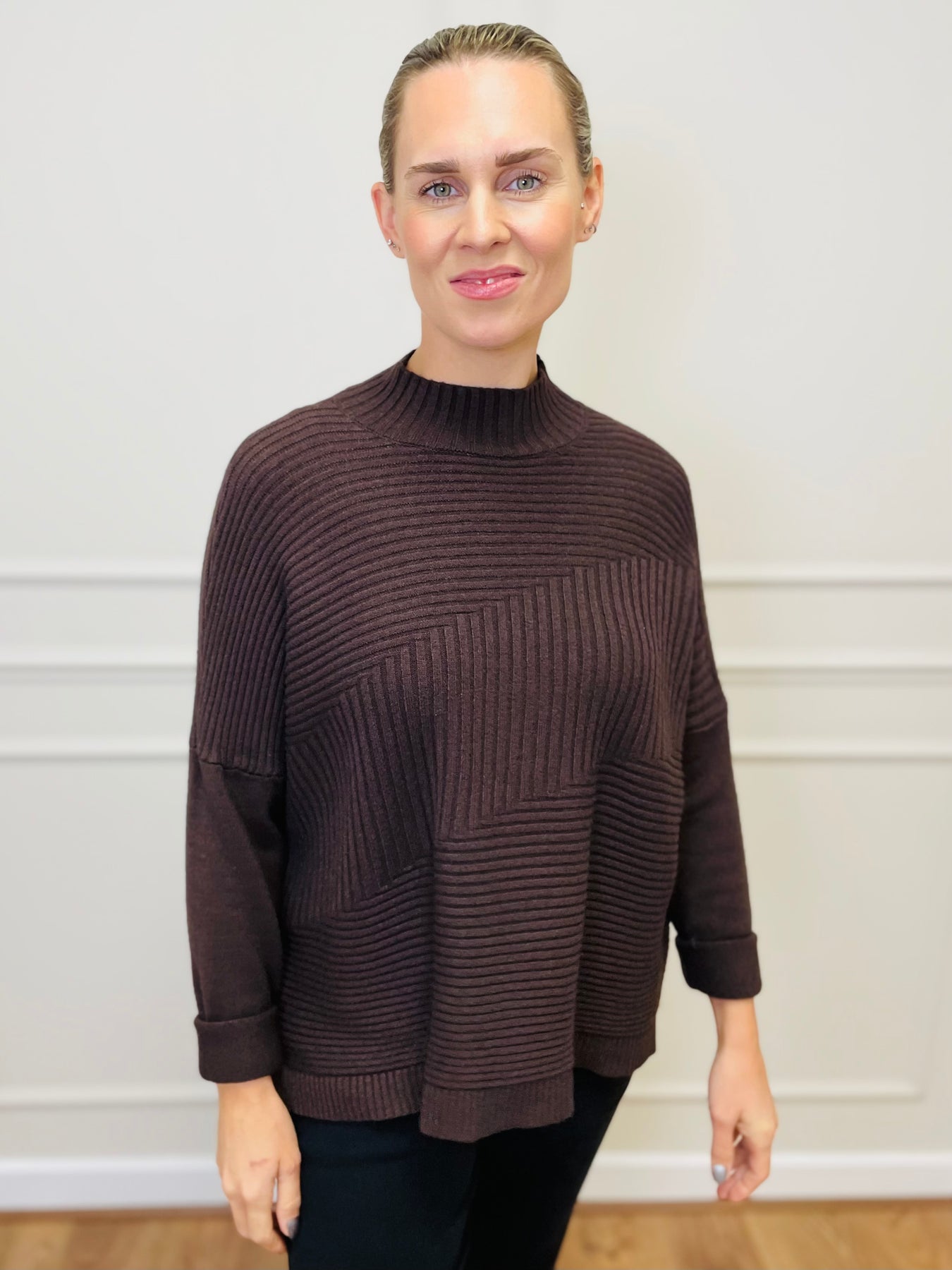 Crafted with a clever mix of rib placements, the knit subtly shapes without clinging—smoothing the midsection, skimming the hips and giving that gentle A-line drape that feels relaxed yet refined. The mock-neck sits elegantly without being tight, and the sleeves are cut with enough room to move comfortably while keeping a neat finish at the wrist.