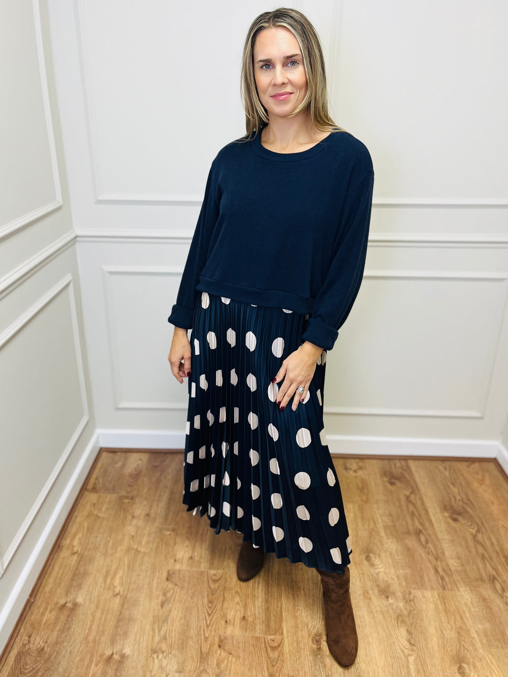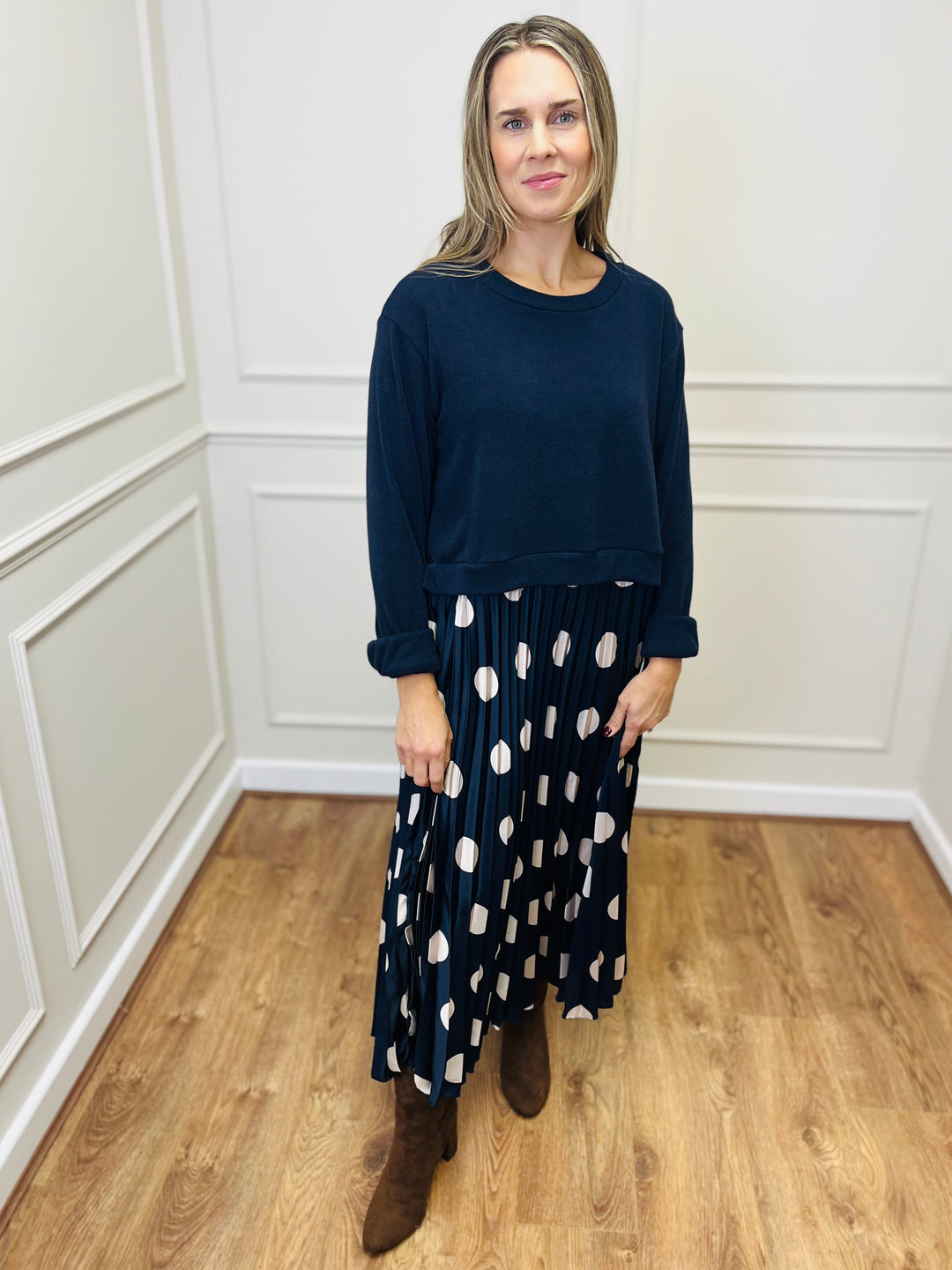 "DOTTY" Polka Dot Pleated Dress-Navy & Cream
