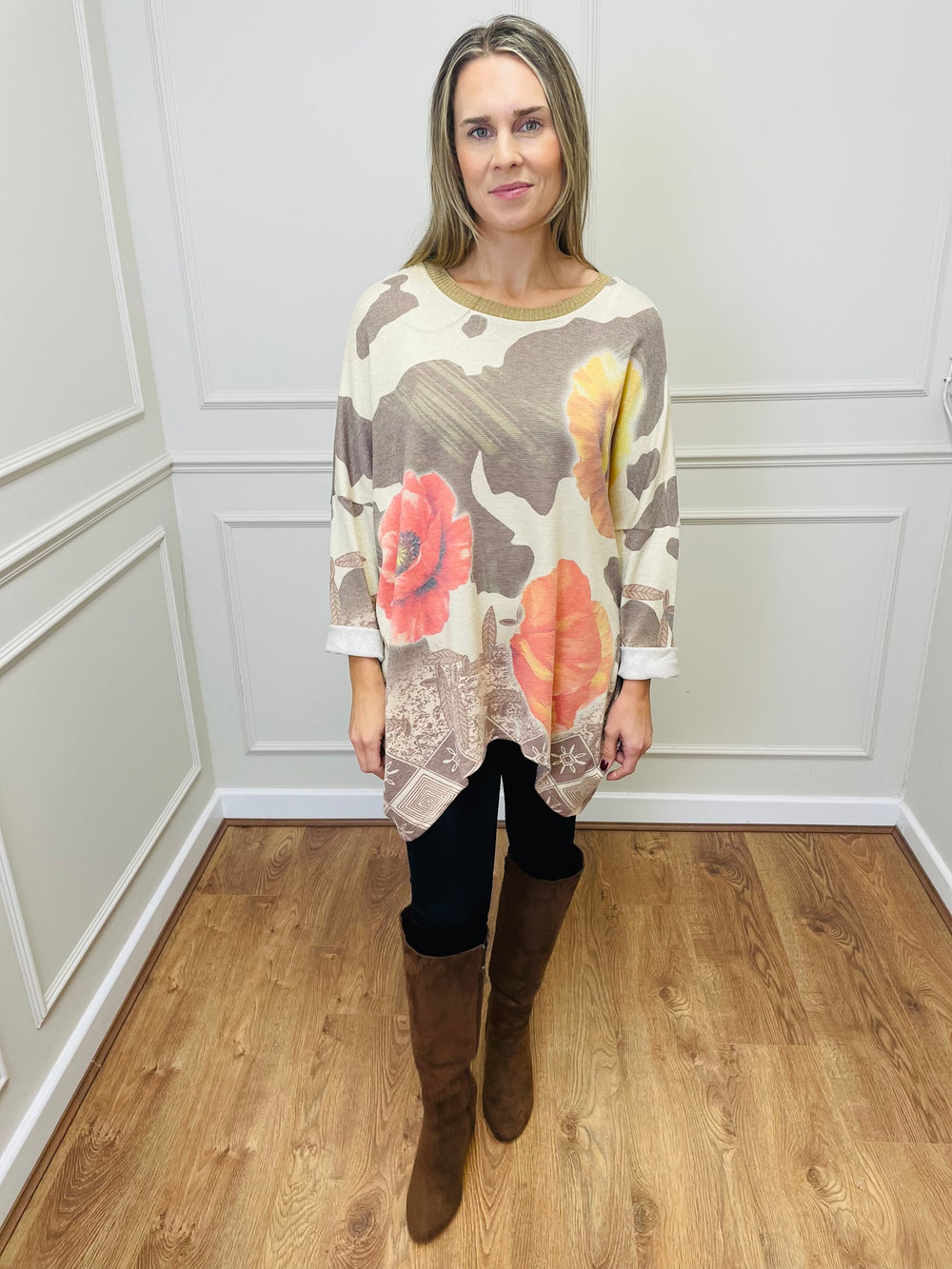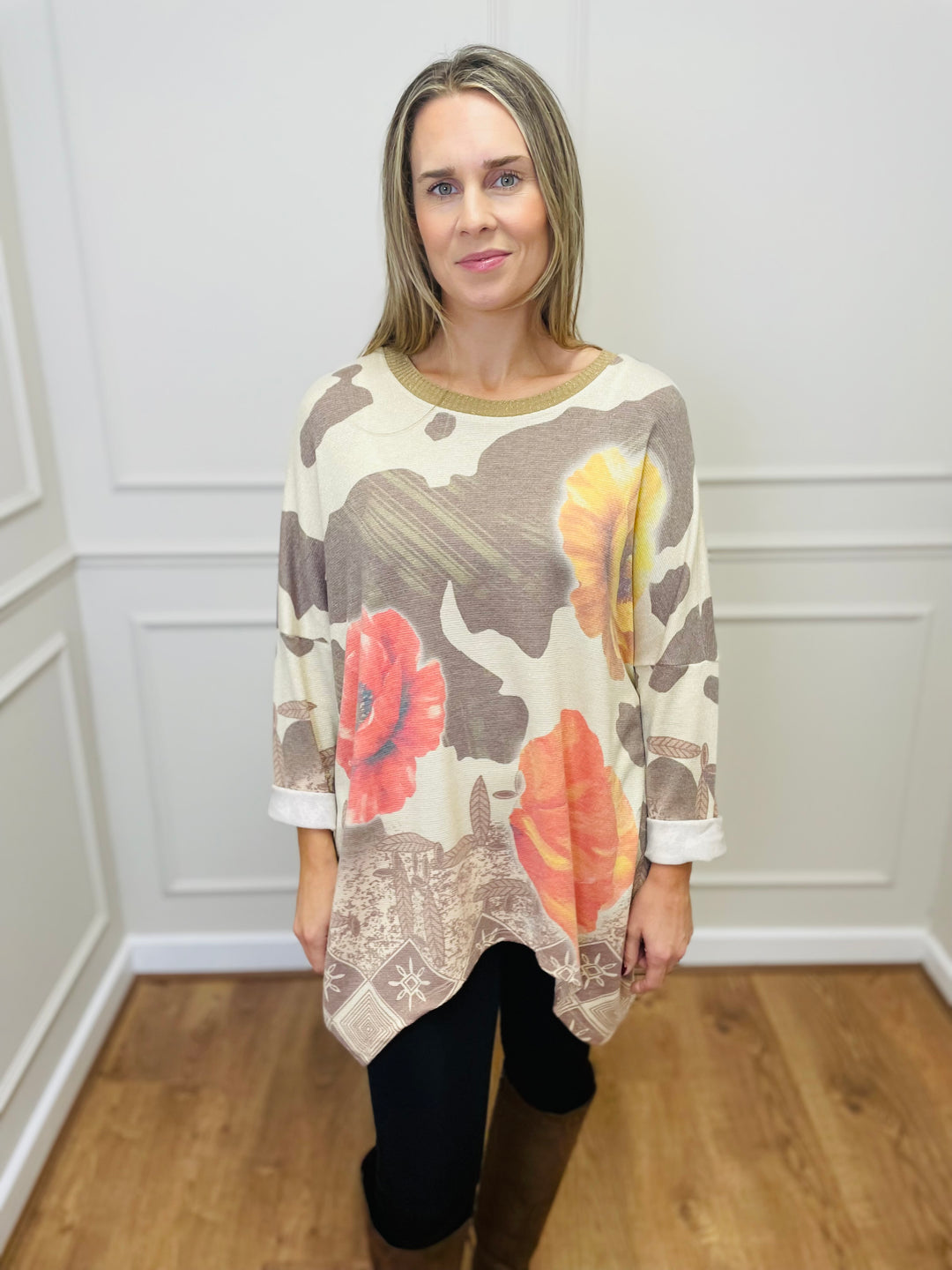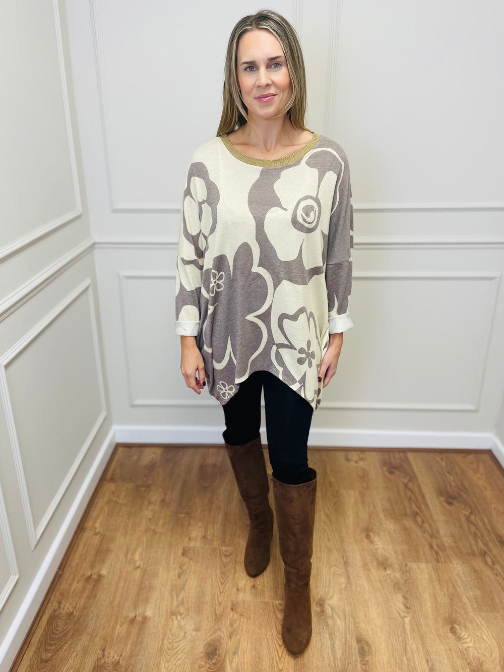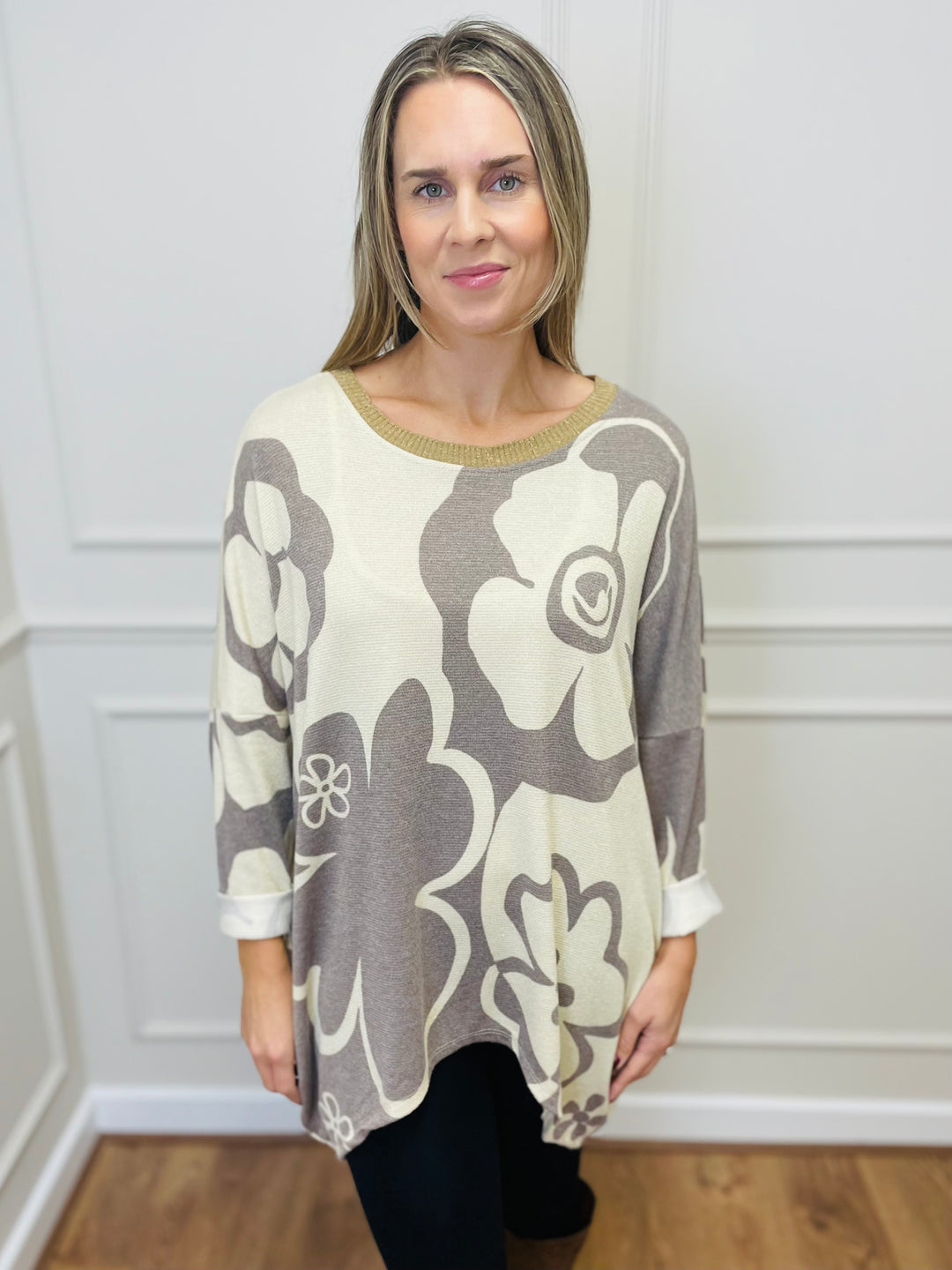 "GINA" Floral Print Fine Knit-Cream & Mocha