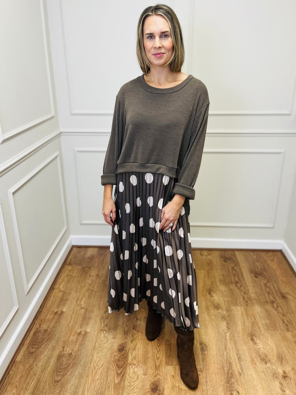 "DOTTY" Polka Dot Pleated Dress-Mocha & Cream