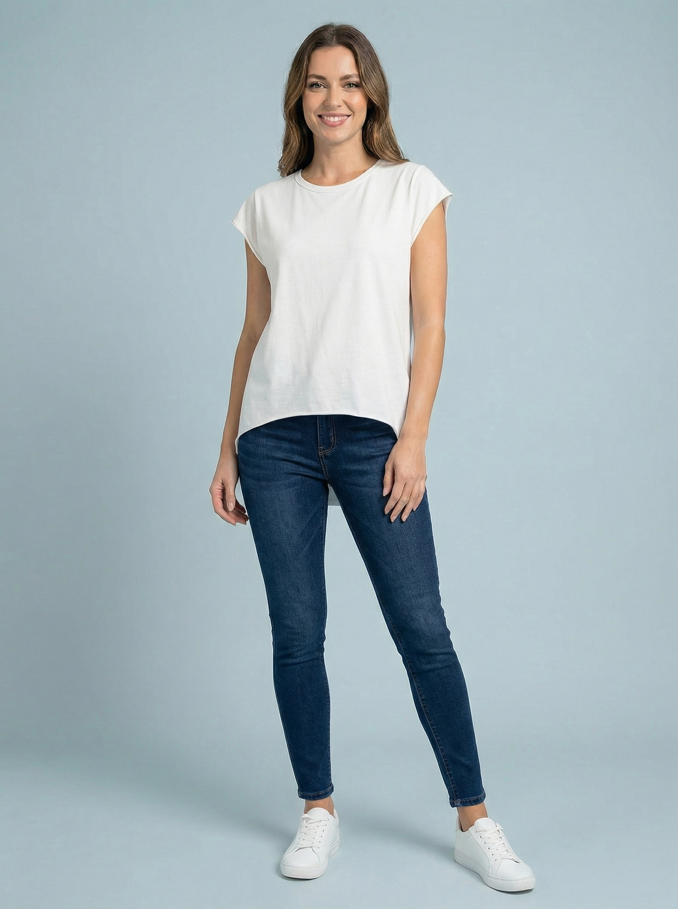 This effortlessly chic cotton top is designed for relaxed comfort and easy everyday wear. Crafted from 100% pure cotton, it feels soft and breathable against the skin, making it ideal for all-day styling. The loose, flattering silhouette drapes beautifully, while the cap sleeves and classic round neckline give it a clean, modern finish.