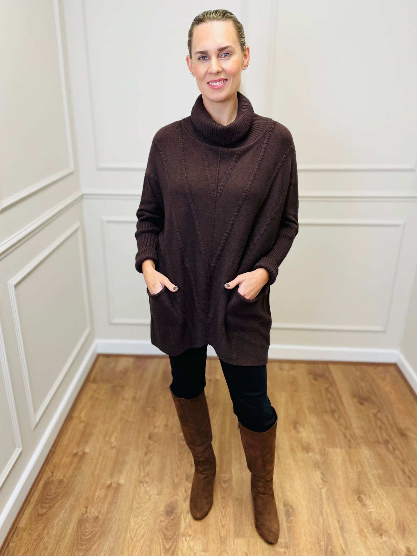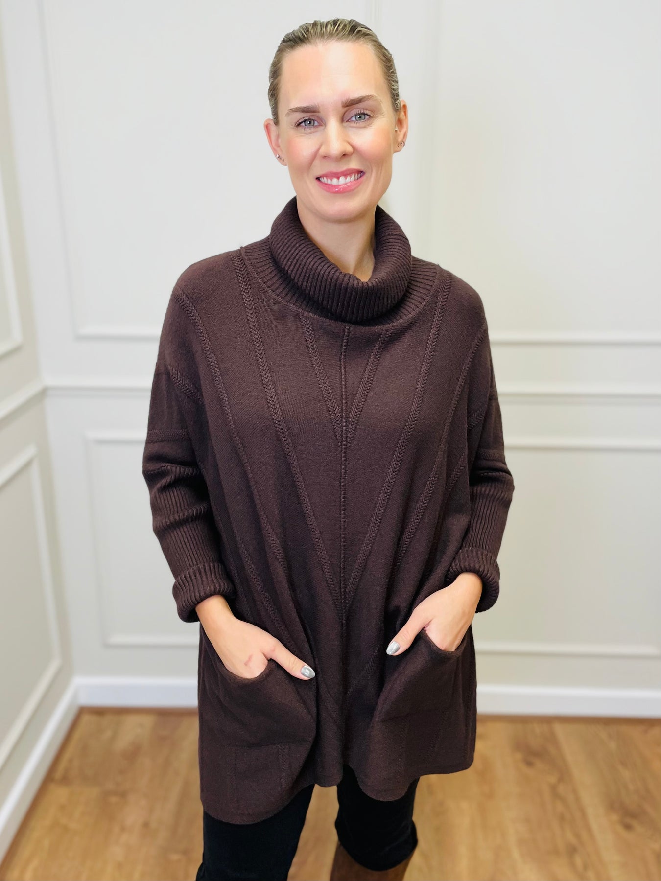The softly structured roll neck sits away from the face rather than clinging, giving warmth without bulk. Clever vertical knit detailing runs through the body, creating a gentle lengthening effect, while the relaxed drop shoulder keeps the shape modern and unrestrictive. Finished with practical front pockets, Grace balances polish with everyday ease.