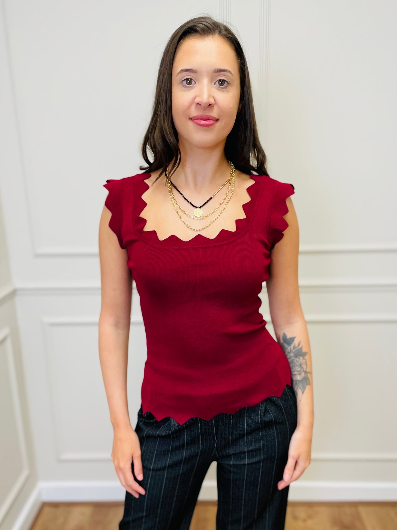 Bring effortless elegance to your wardrobe with the Carly Vest Blouse – a versatile knit top designed with both comfort and style in mind. The standout feature is its scalloped neckline and hemline, adding a modern feminine twist to a classic silhouette.