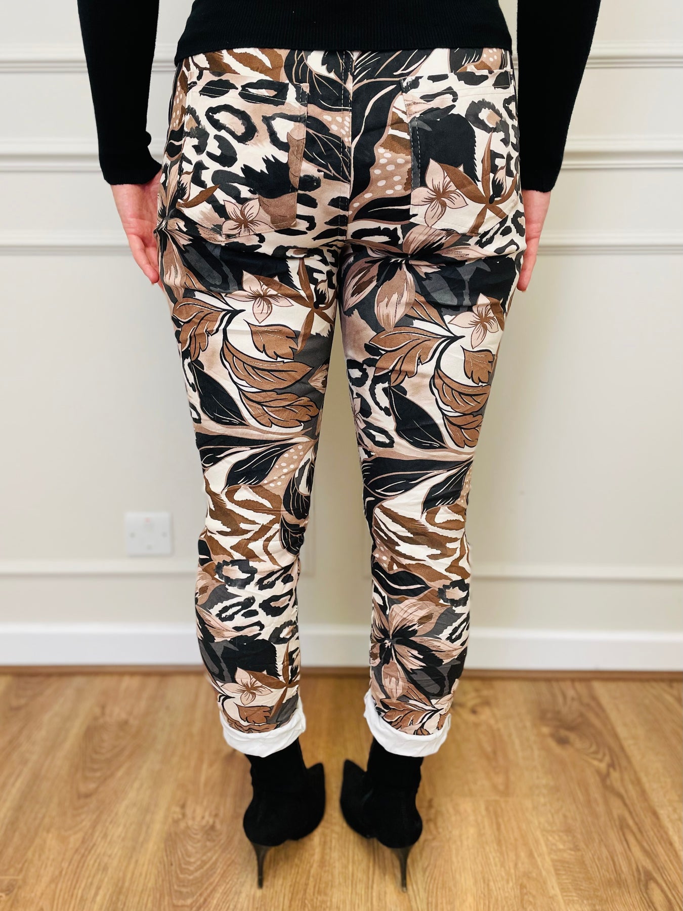"CARMELA" Animal & Floral Print Trouser-Brown & Cream