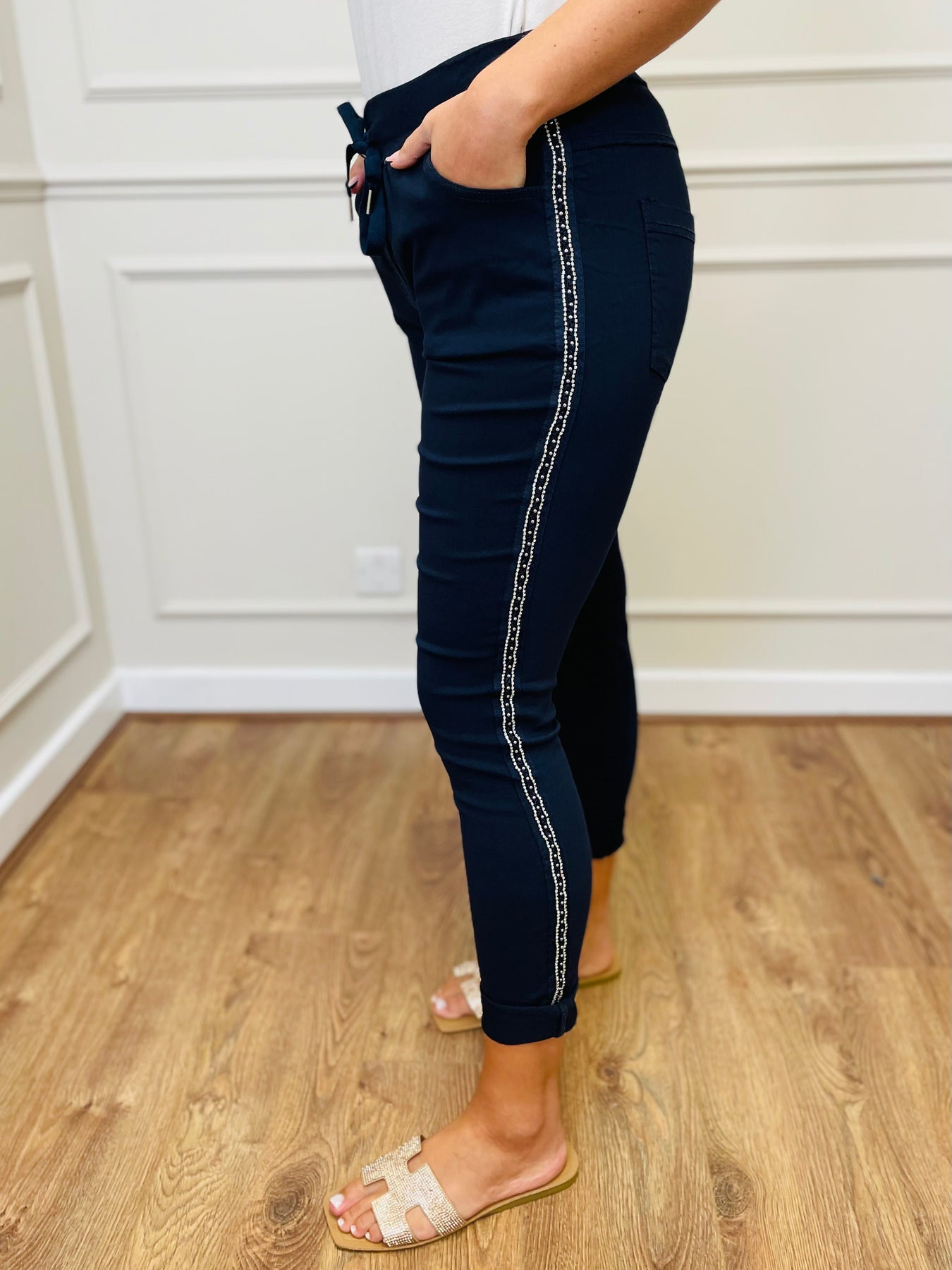 Upgrade your casual style with these chic trousers featuring subtle side embellishment for that extra touch of sparkle.