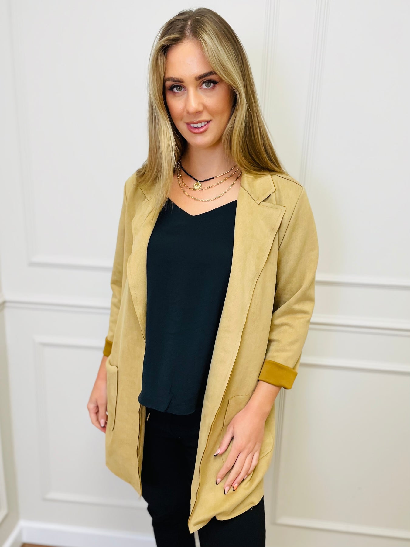 Upgrade your wardrobe with our "CROSBY" Mid Length Jacket, a versatile layering piece available in a range of stunning colours. Designed with a soft, luxe suede-touch fabric, this jacket combines comfort with effortless style. The tailored open-front design and practical side pockets make it the perfect blend of chic and functional, while its lightweight structure ensures year-round wear.