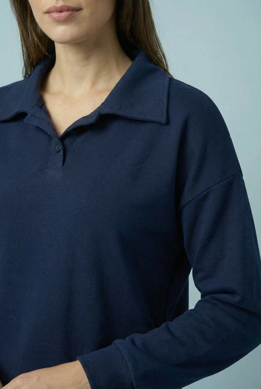 The ELODIE Scuba Sweat Top is a sophisticated essential that brings an athletic yet polished edge to your daily wardrobe, featuring a structured scuba fabric that holds a clean silhouette while remaining incredibly soft and comfortable against the skin for an effortlessly confident look that never clings to the body. This Italian-made piece elevates the classic sweatshirt design with a smart pointed collar and a subtle button-down neckline, blending a modern sporty aesthetic with refined tailoring to create a versatile top that feels both understated and thoughtfully balanced for any occasion.