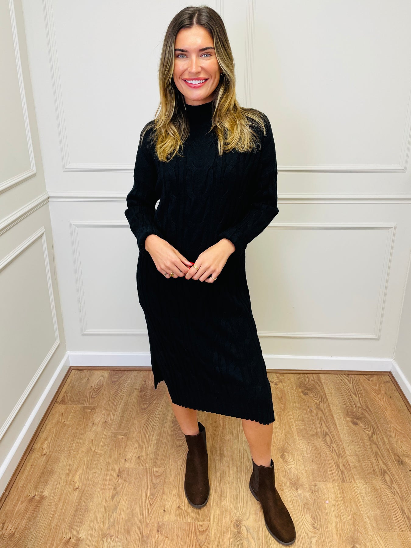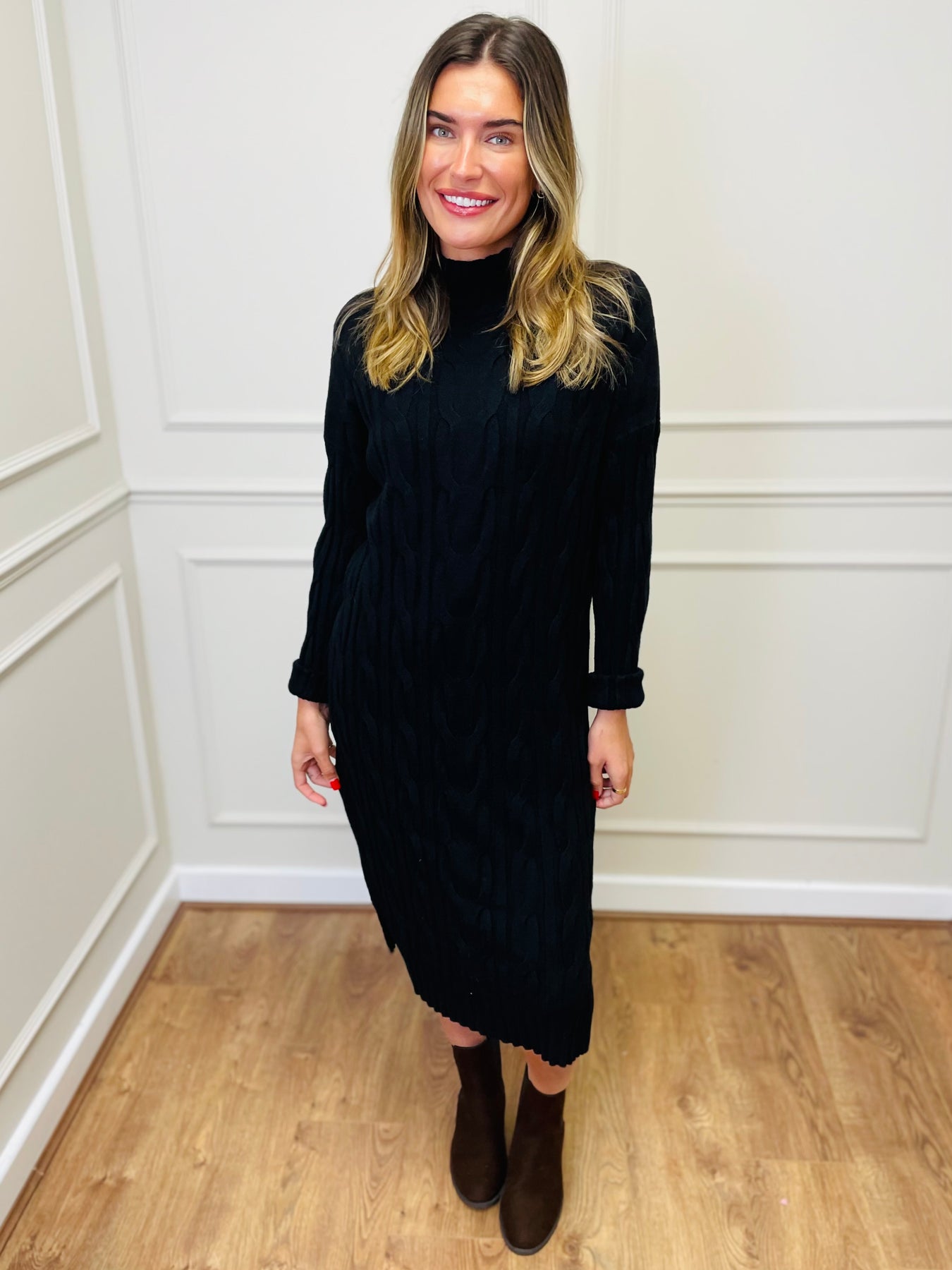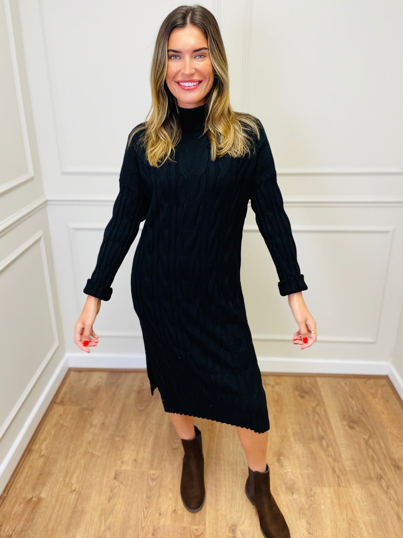 "ELY" Cable Knit Midi Dress-Black