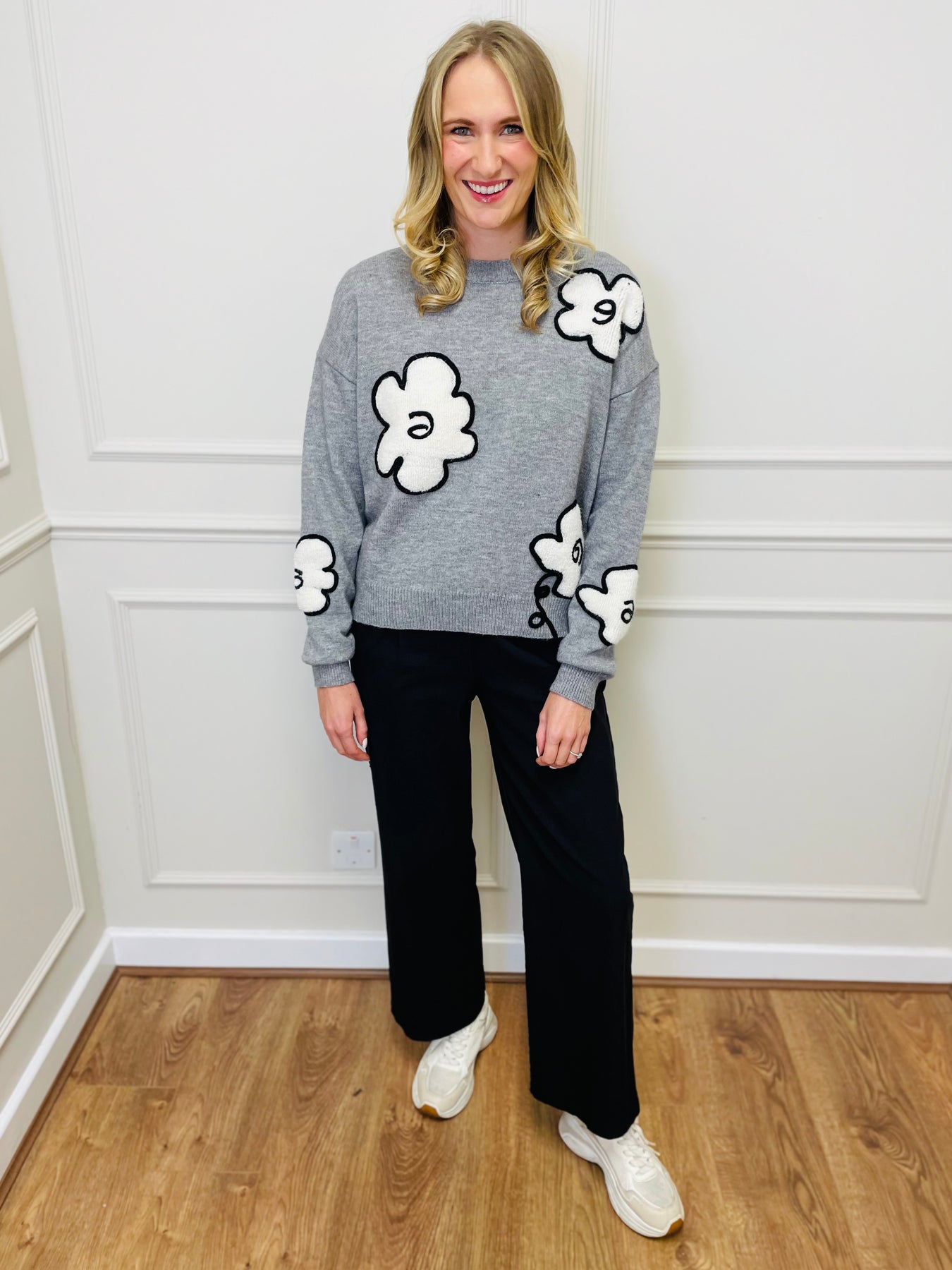 Playful, cosy, and full of personality — the Flora Sweater brings a cheerful twist to your knitwear collection. Featuring oversized embroidered flower appliqués with bold contrast outlines, this jumper creates a fun, standout look while still feeling soft and wearable for everyday styling.