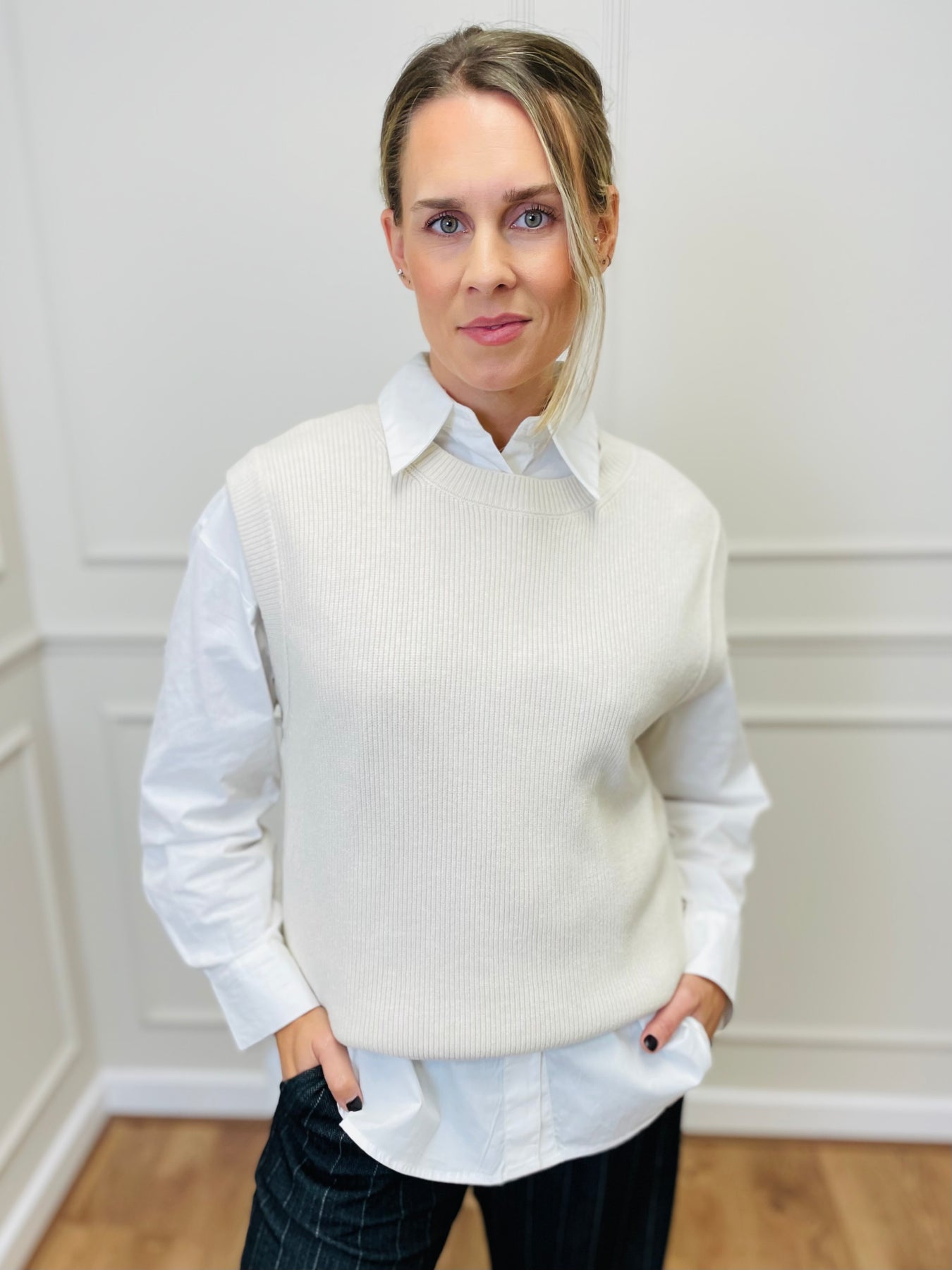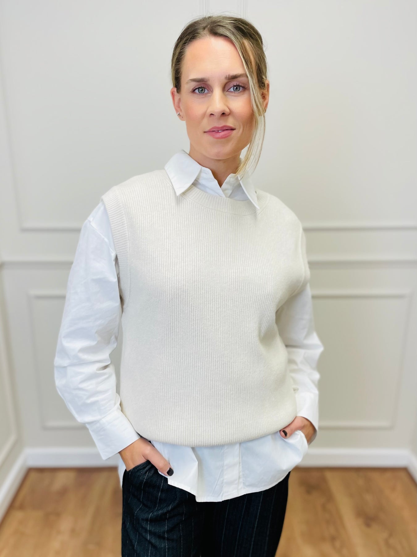Crafted from a soft, mid-weight knit, Lili features a classic crew neckline and clean, minimalist silhouette that pairs perfectly with crisp shirts, fine knits, or lightweight blouses. Whether styled for the office or weekend brunch, this vest brings understated sophistication to every look.