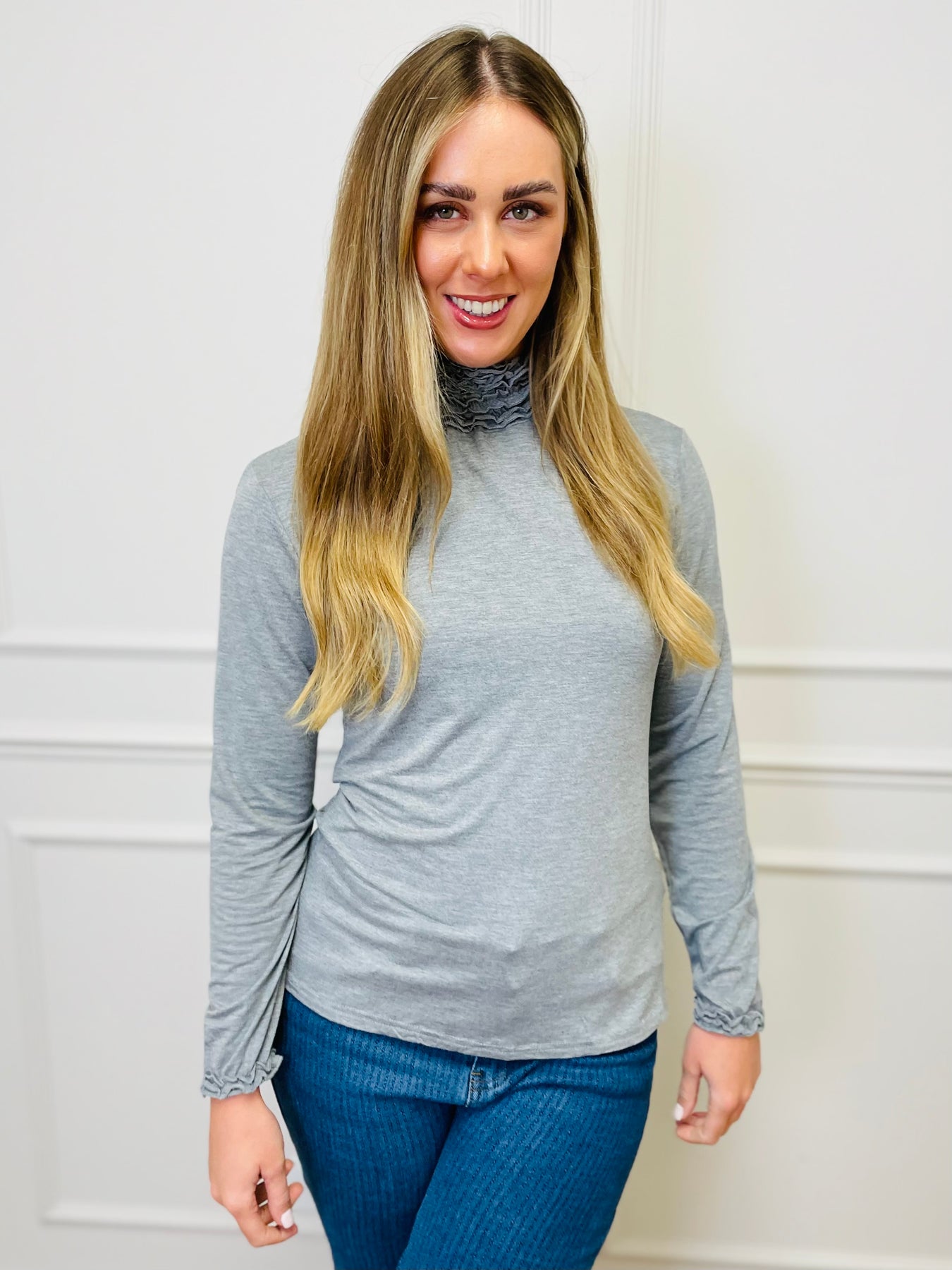 "LIVIA" Ruffle Polo Neck Top-Silver