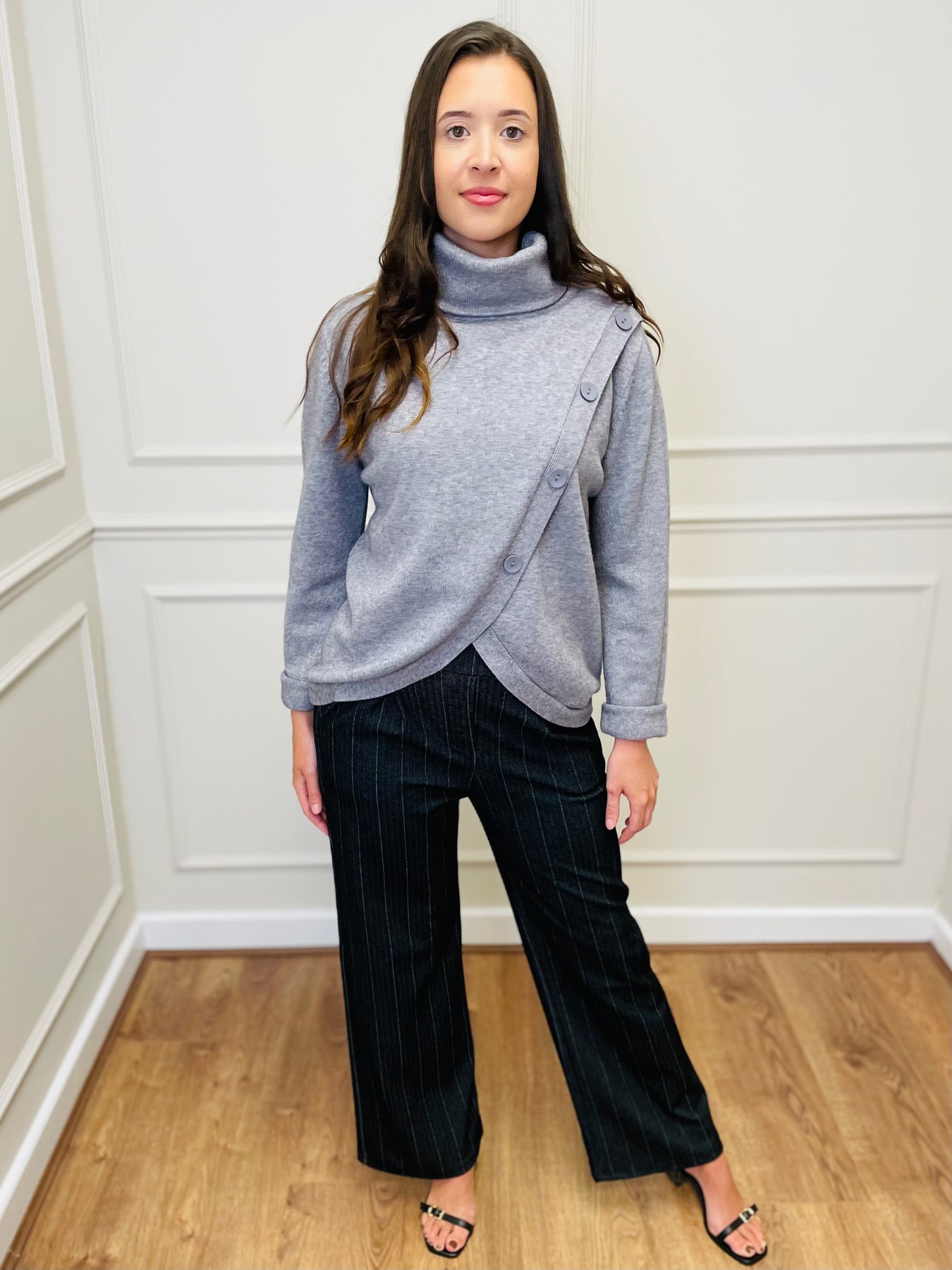 Effortless sophistication meets cozy comfort with the Luna Wrap Button Jumper. Designed with a unique asymmetrical wrap front and soft roll neck, this jumper is the perfect blend of modern style and timeless elegance.