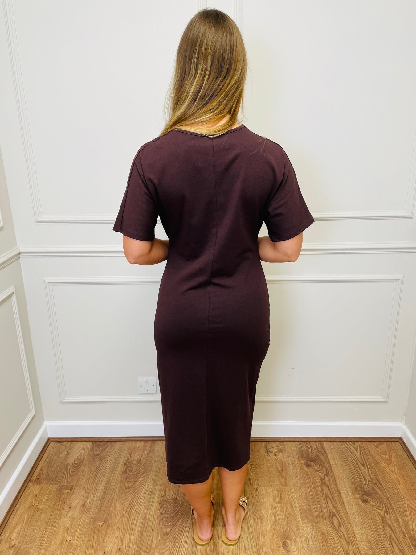 Step into timeless elegance with our Chic Chocolate Brown Midi Dress, a wardrobe essential designed to flatter and impress. Crafted from a soft, stretch fabric, this dress offers a sleek, body-skimming fit that moves with you effortlessly. Featuring short sleeves, a classic round neckline, and a side-slit hemline for a touch of allure, this versatile piece is perfect for both day and evening wear.
