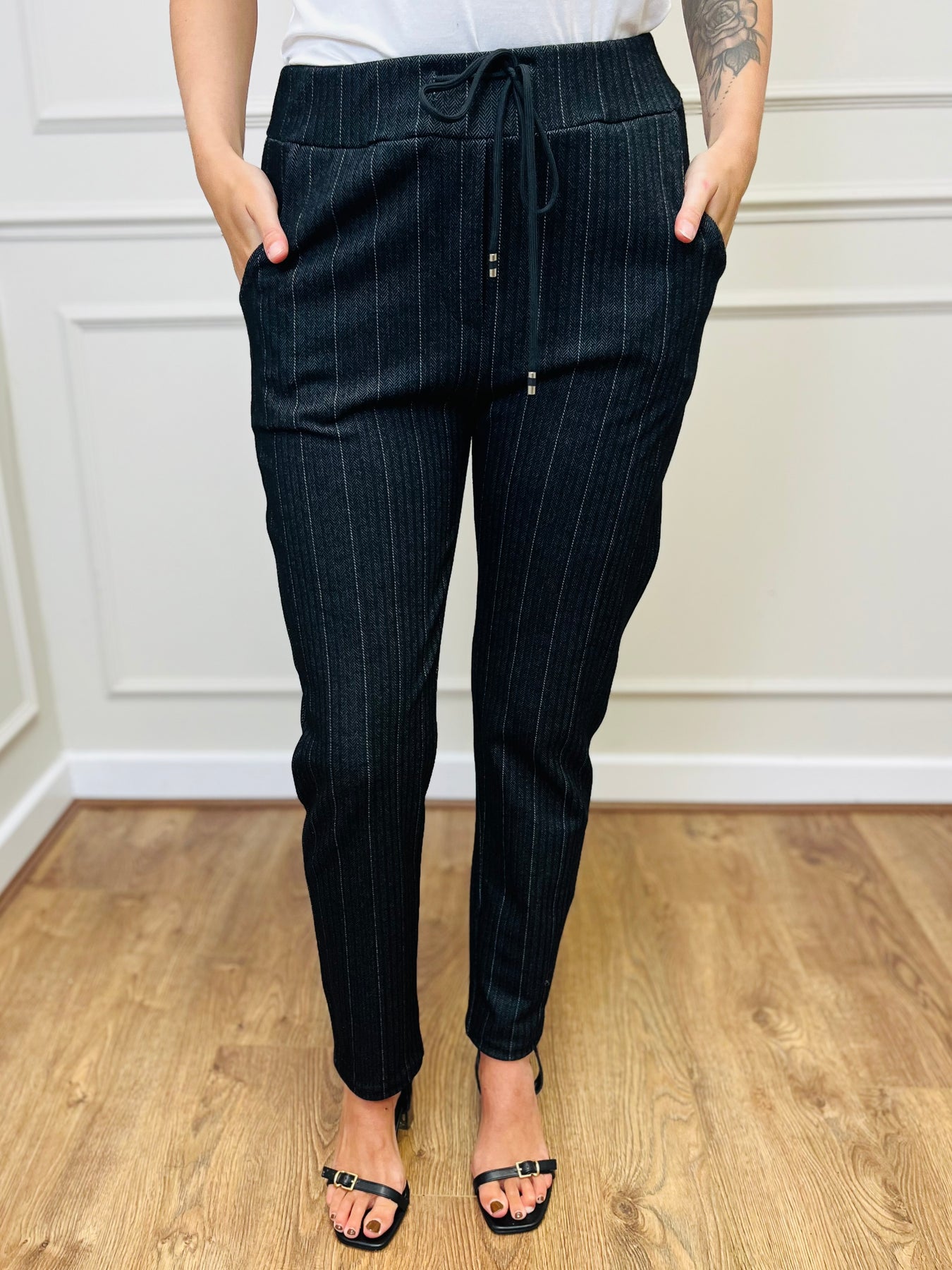 Meet your new go-to pair for effortless style and all-day comfort — our Tailored Pinstripe Drawstring Pants. Combining the polish of tailored trousers with the relaxed feel of joggers, these pants redefine smart-casual dressing for the modern woman.