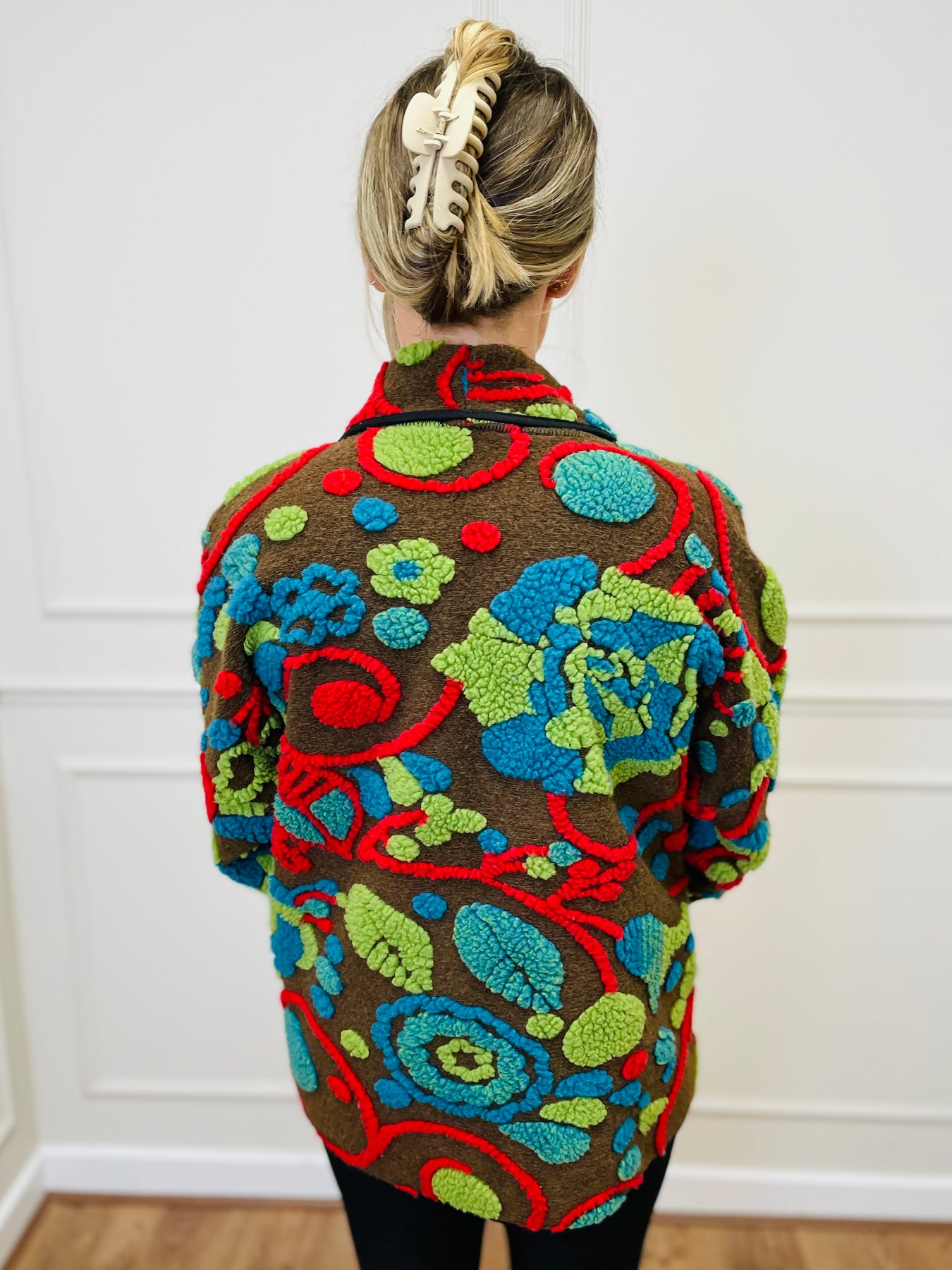 The Nancy Jacket is where art meets comfort — a striking statement piece designed to turn heads while keeping you effortlessly cosy. Crafted in a soft, textured jacquard fabric, it features bold, tactile embroidery in vibrant colour combinations and an easy, relaxed fit that flatters sizes 10–18.