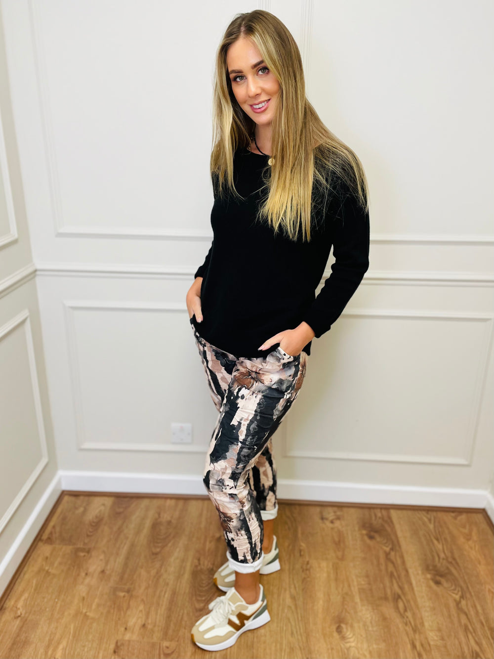 "CARMELA" Floral Print Trouser-Camel & Black