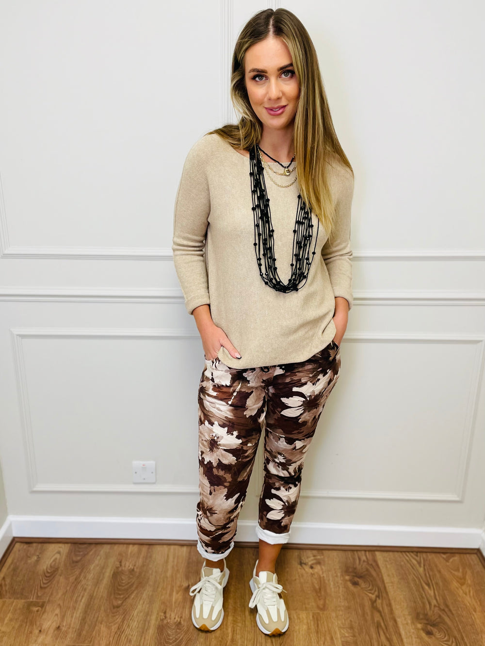 "CARMELA" Floral Print Trouser-Tan & Cream
