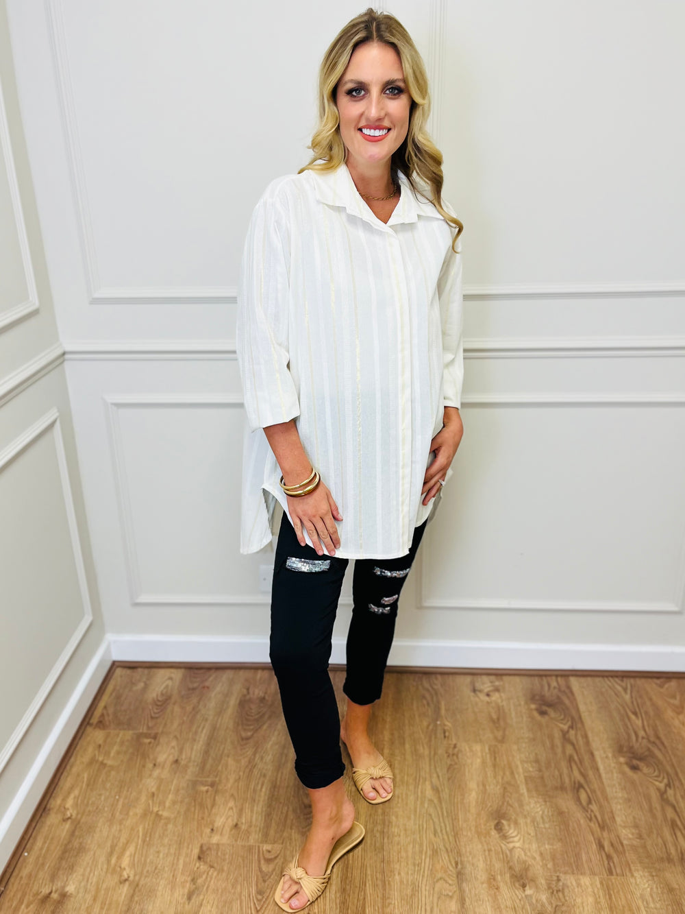 "LEAH" Pin Stripe Shirt-White & Gold