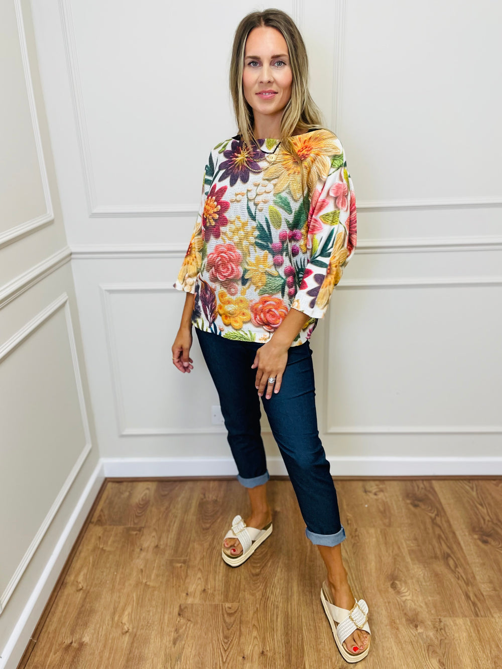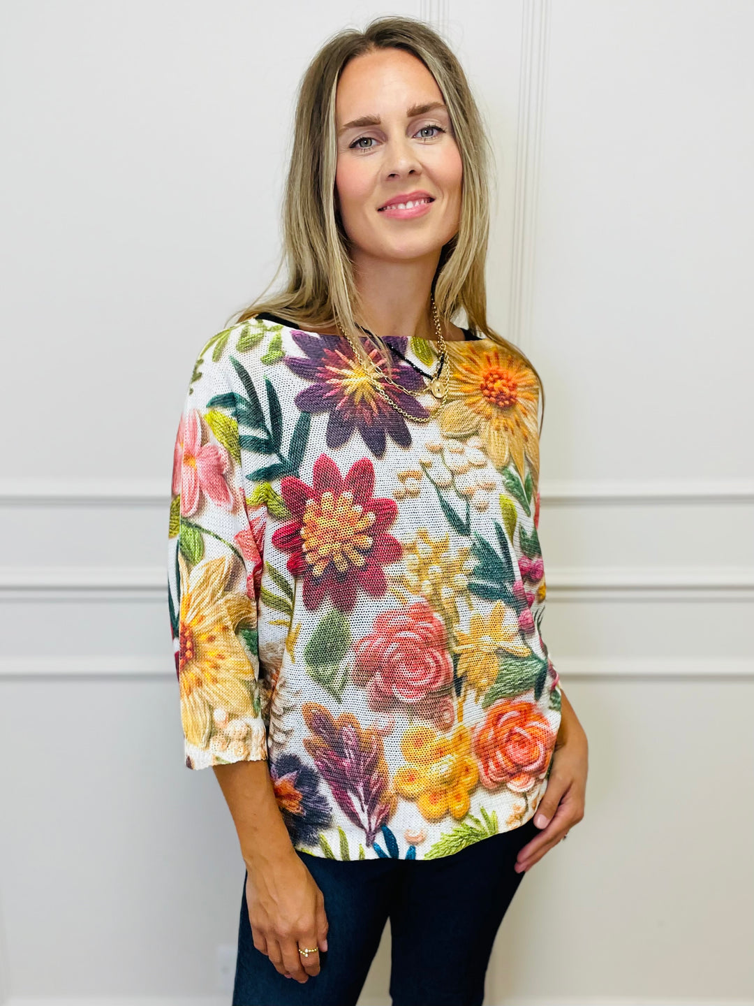"GINA" Floral Print Fine Knit-Cream & Multicolour