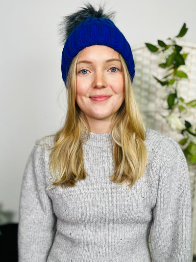 Blue Knit Faux Fur Pom Hat