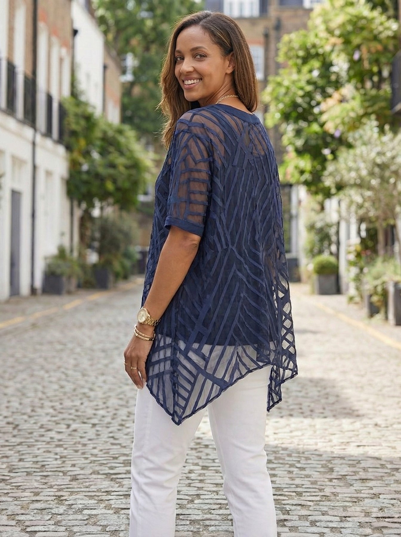 "LILLY” Geometric Textured Top  With Vest - Navy