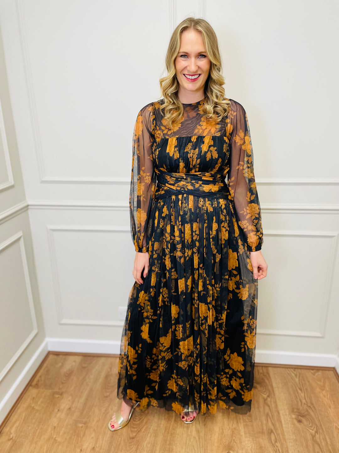 "STACEY" Chiffon Floral Dress-Black & Orange