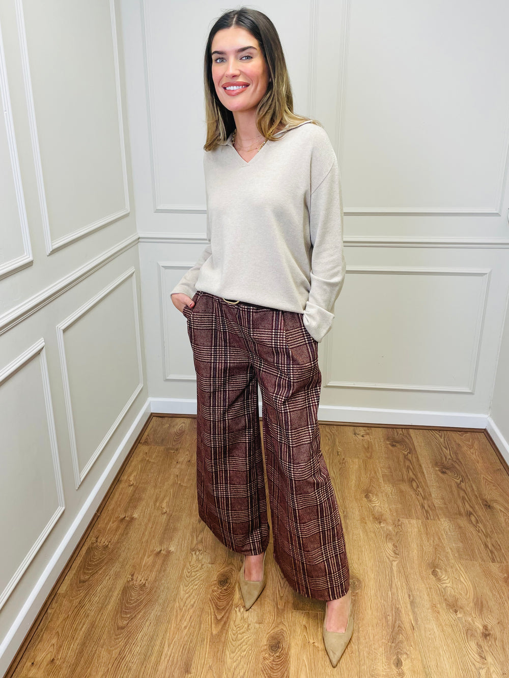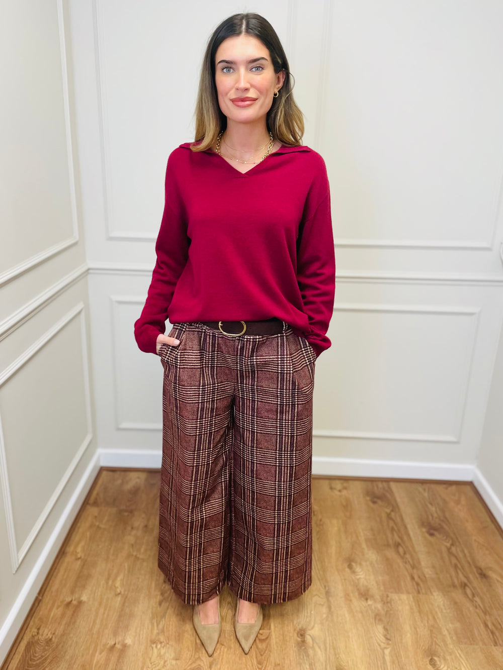 "ALANI" Check Print Trouser-Burgundy/Cream & Navy
