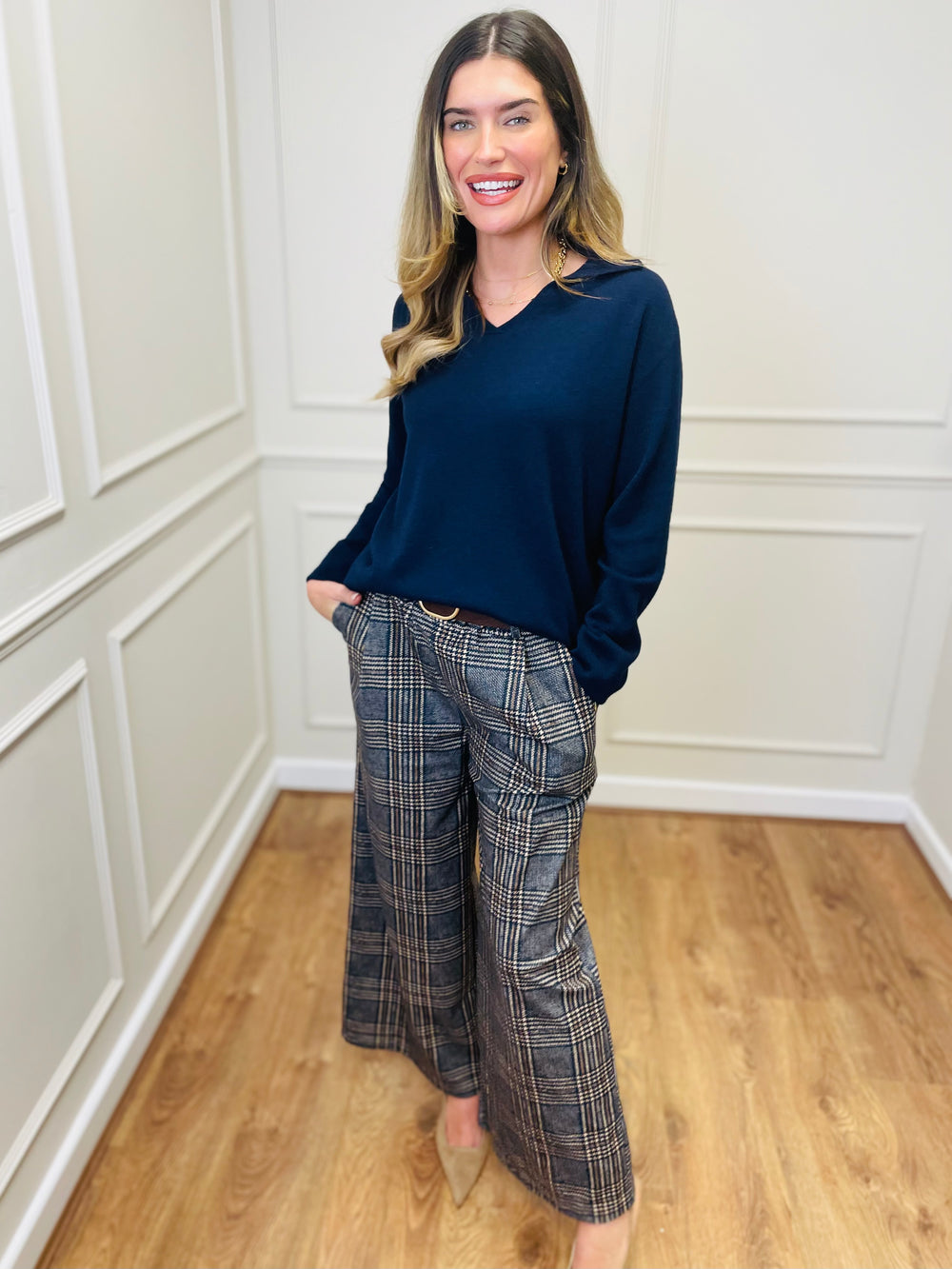 "ALANI" Check Print Trouser-Navy/Cream & Brown