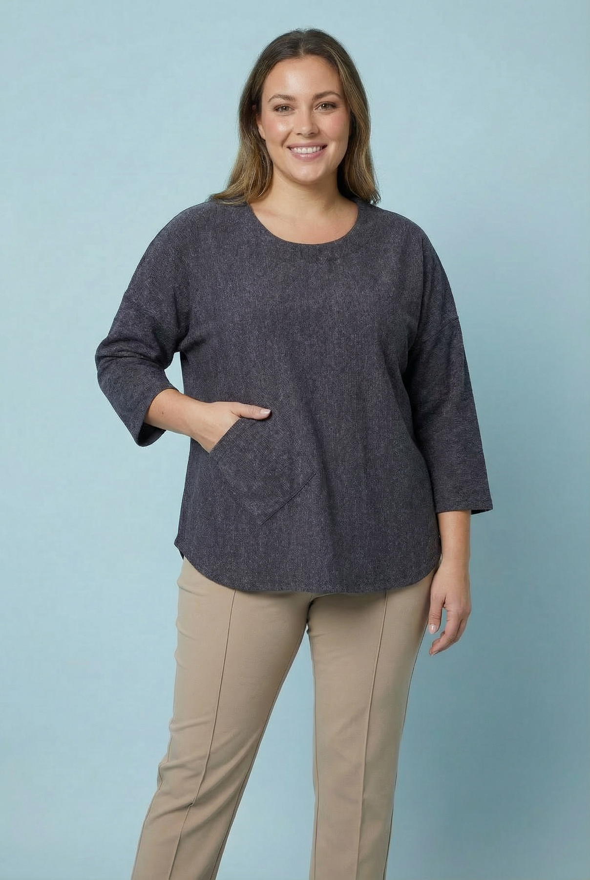 Experience effortless elegance with the "AMIRA" Soft Knit Top. Artfully crafted with a relaxed silhouette and refined three-quarter sleeves, this charcoal piece features a unique architectural pocket and curved hem, blending sophisticated minimalist design with a luxuriously tactile finish.