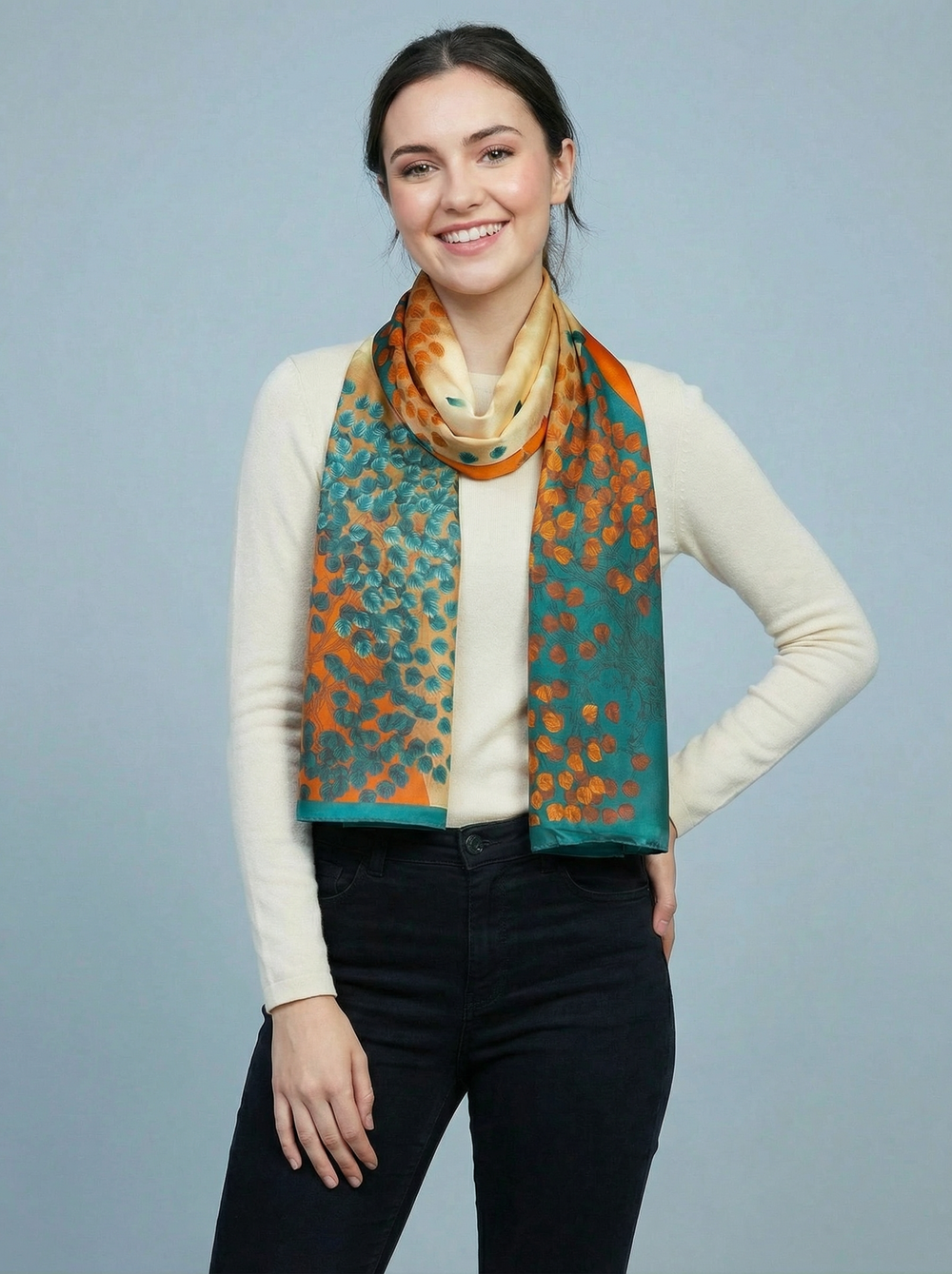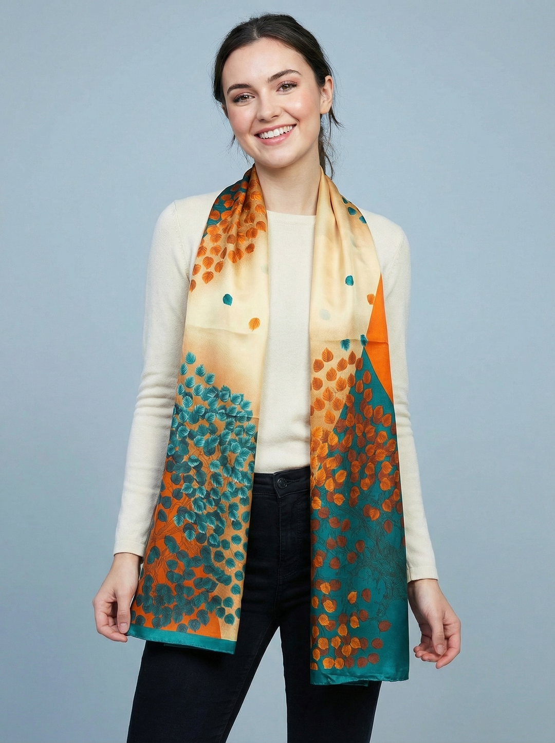 No.99 Artistic Print Silk Scarf-Cream & Orange