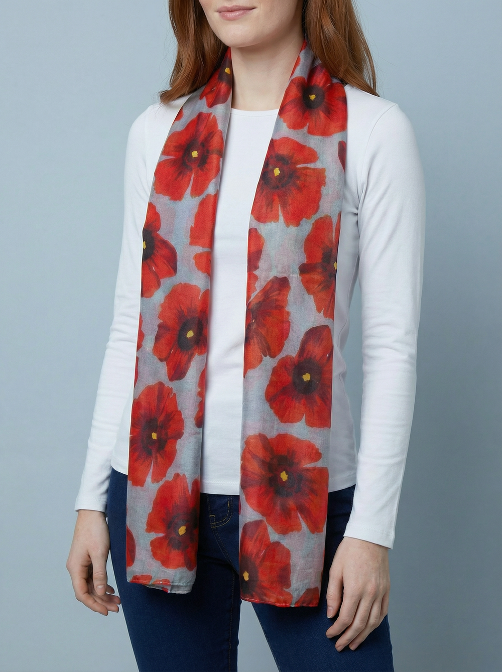 No.119 Poppy Print Scarf-Grey & Red