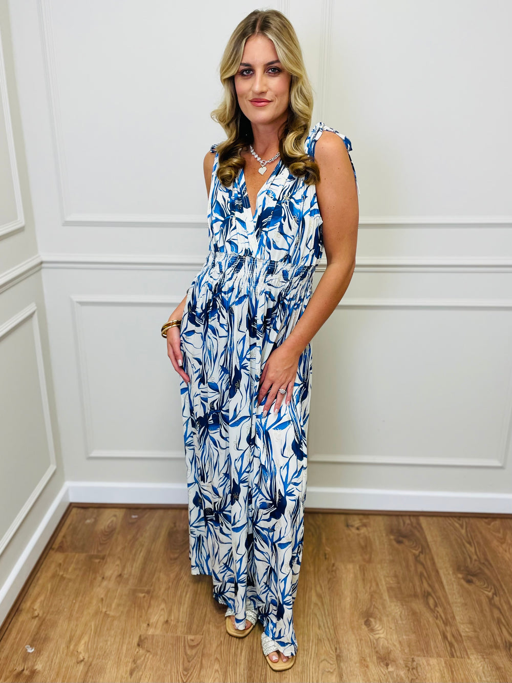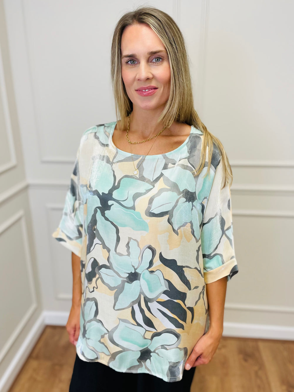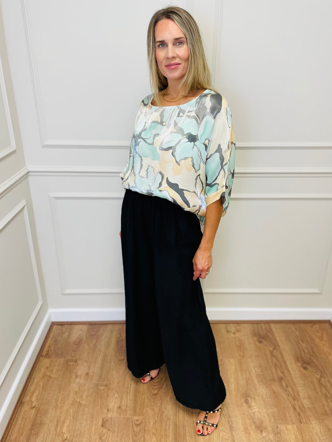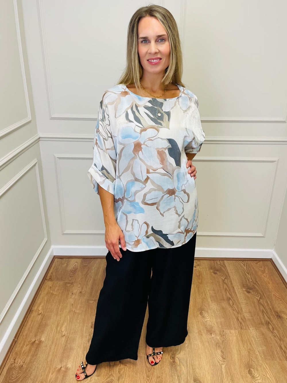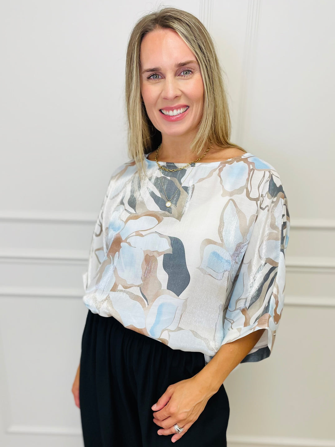 "TERESA" Abstract Print Blouse-Cream & Navy