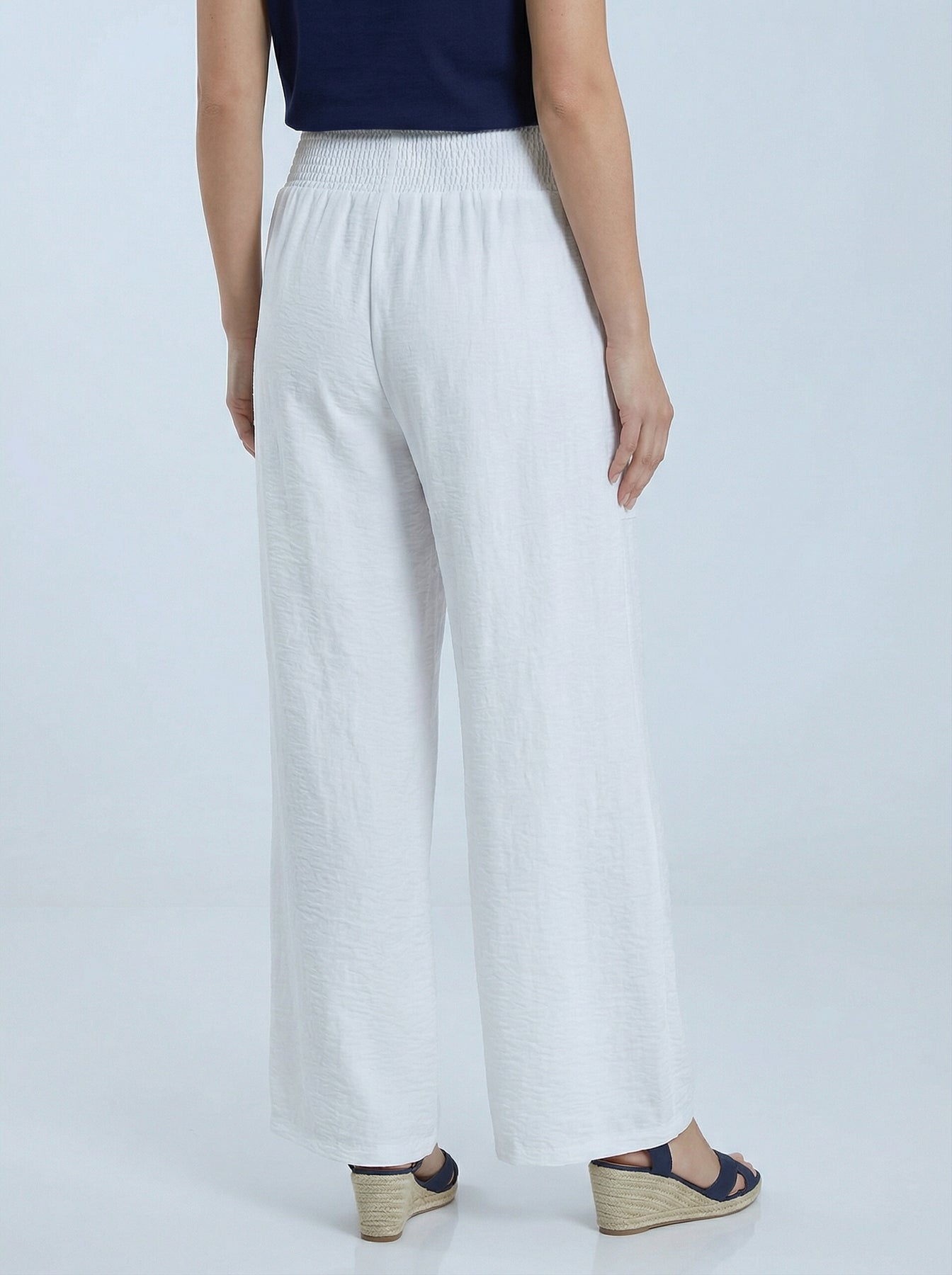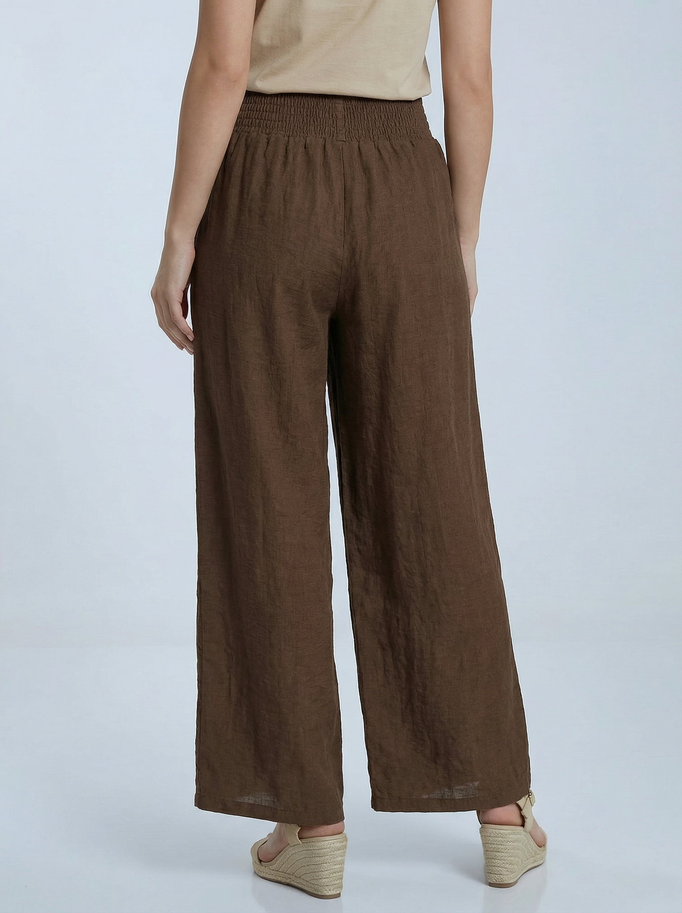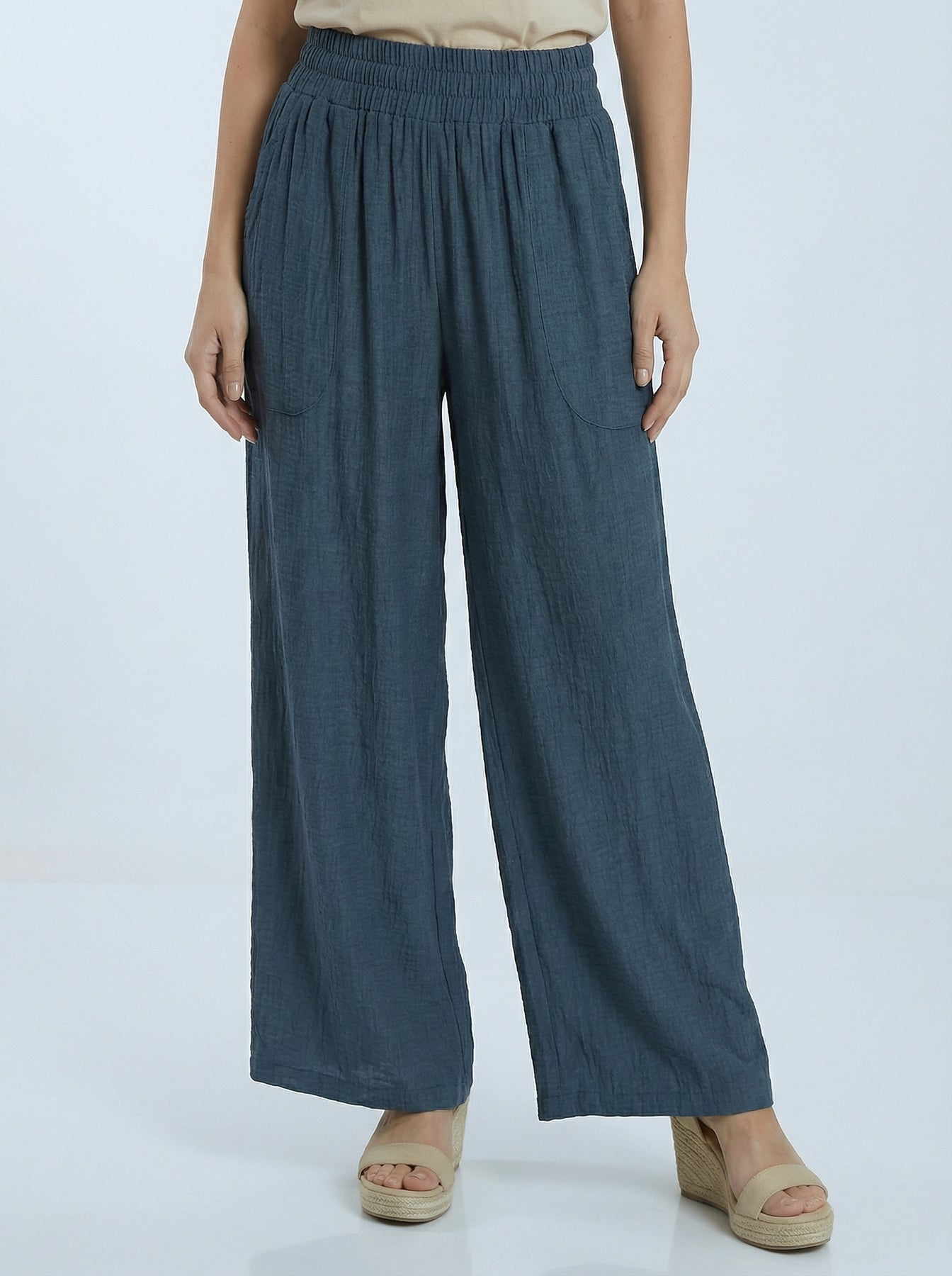 Slip into effortless elegance with the Allegra Trousers. These wide-leg, high-waisted pants feature a beautifully textured fabric, flowy silhouette, and smocked waistband for a flattering, relaxed fit. Complete with oversized front pockets, they offer the perfect blend of comfort and sophistication — ideal for brunch, travel, or lounging in style.