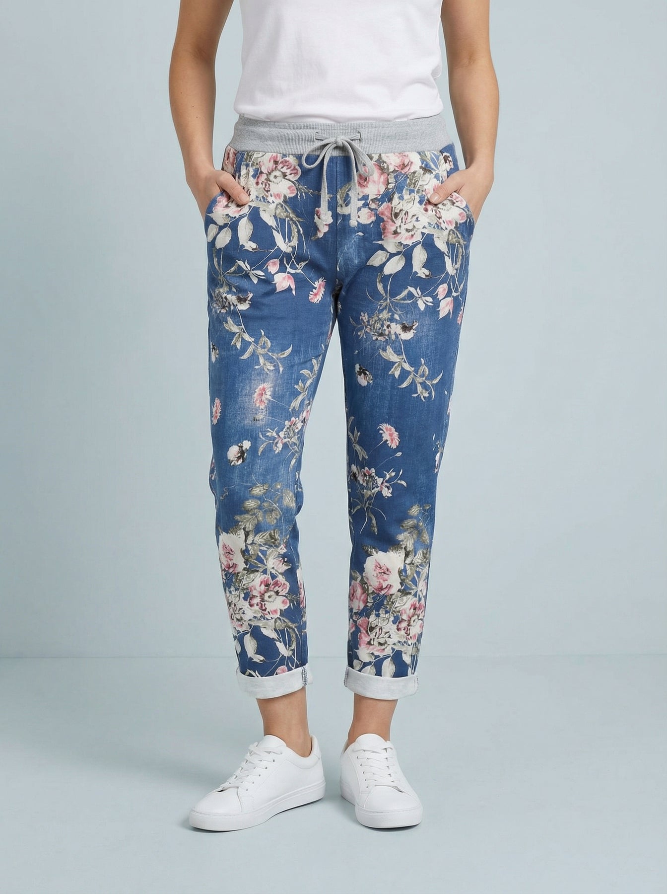 "RIO" Floral Print Magic Trouser - Dark Denim