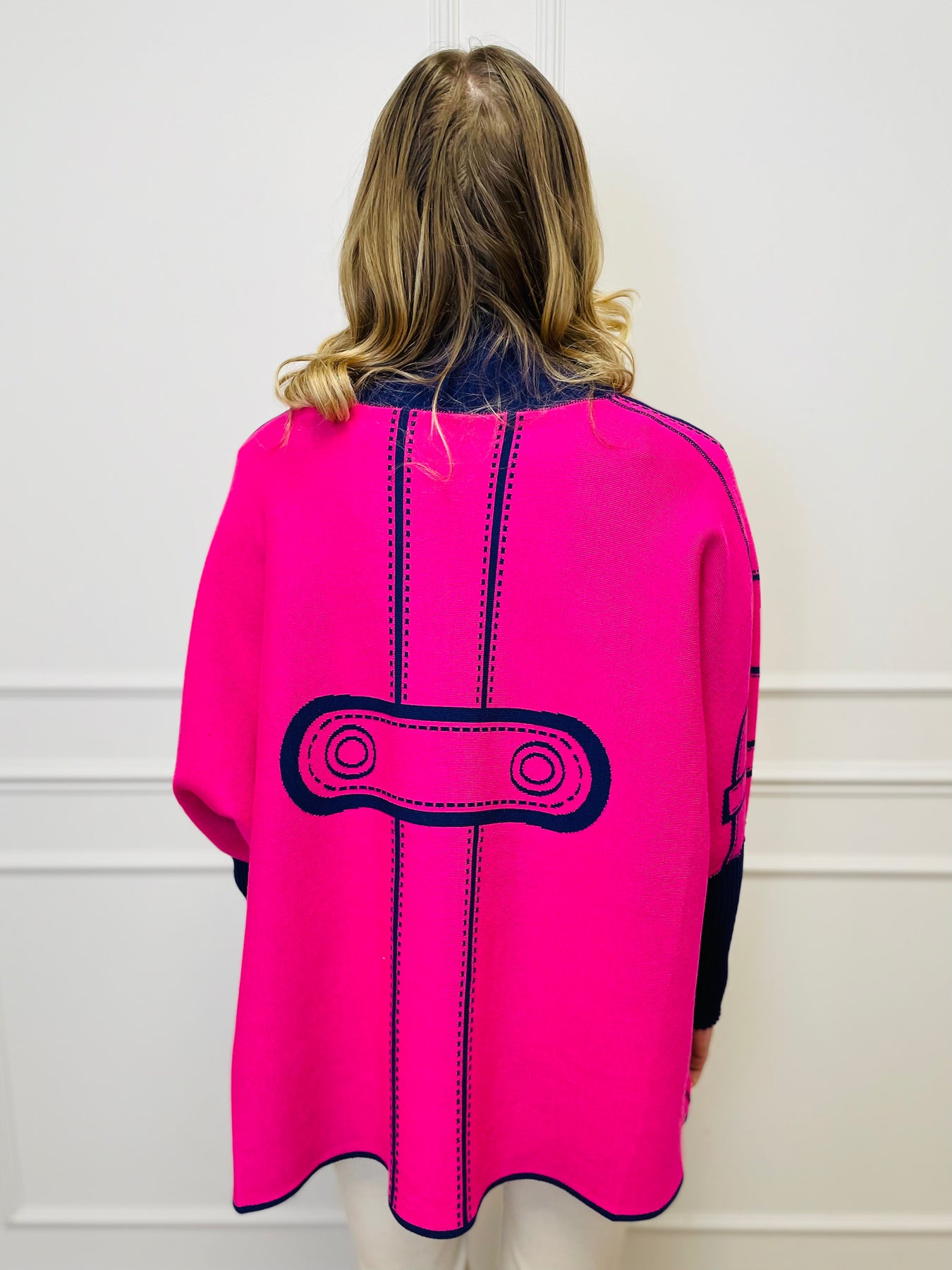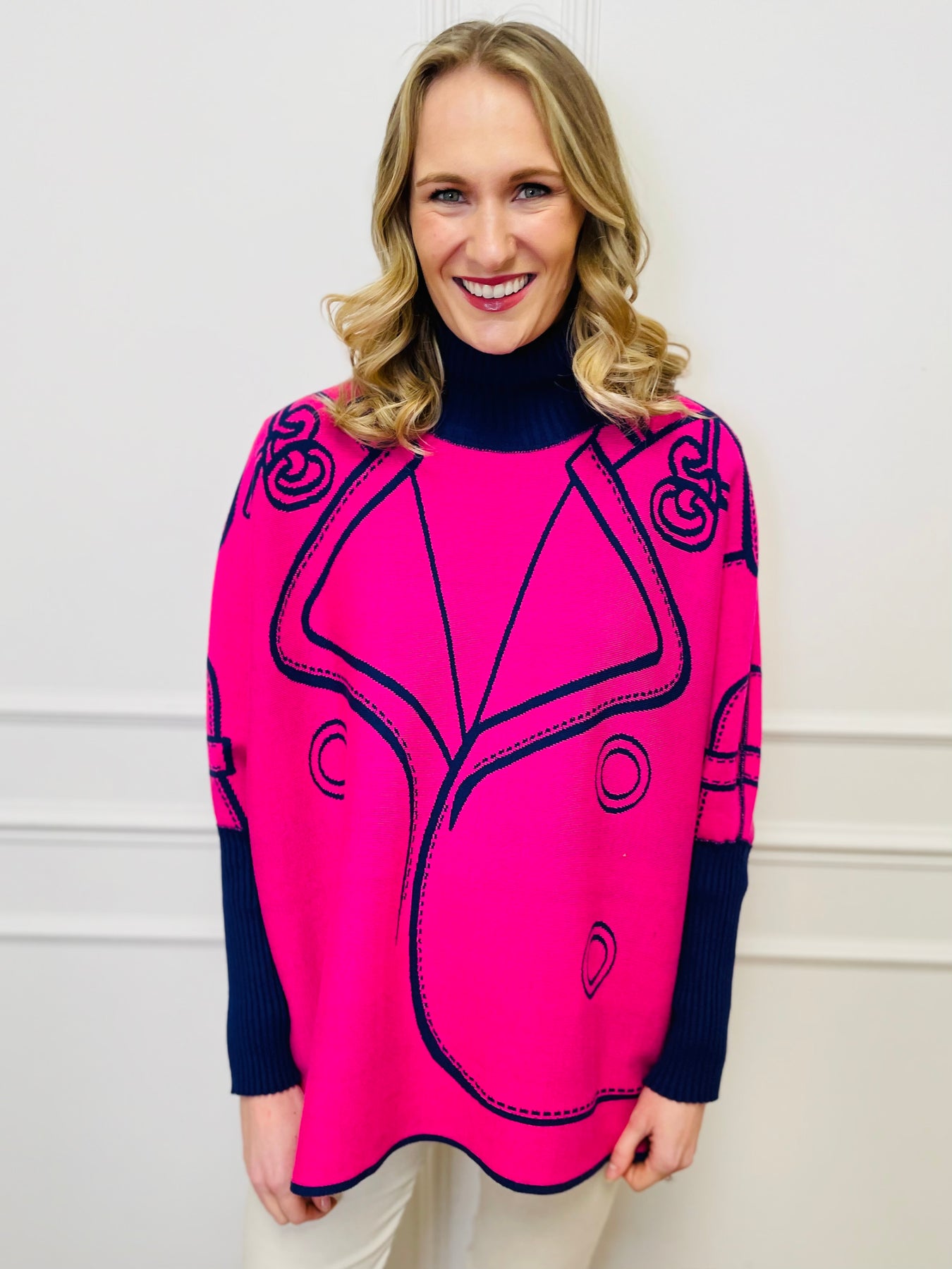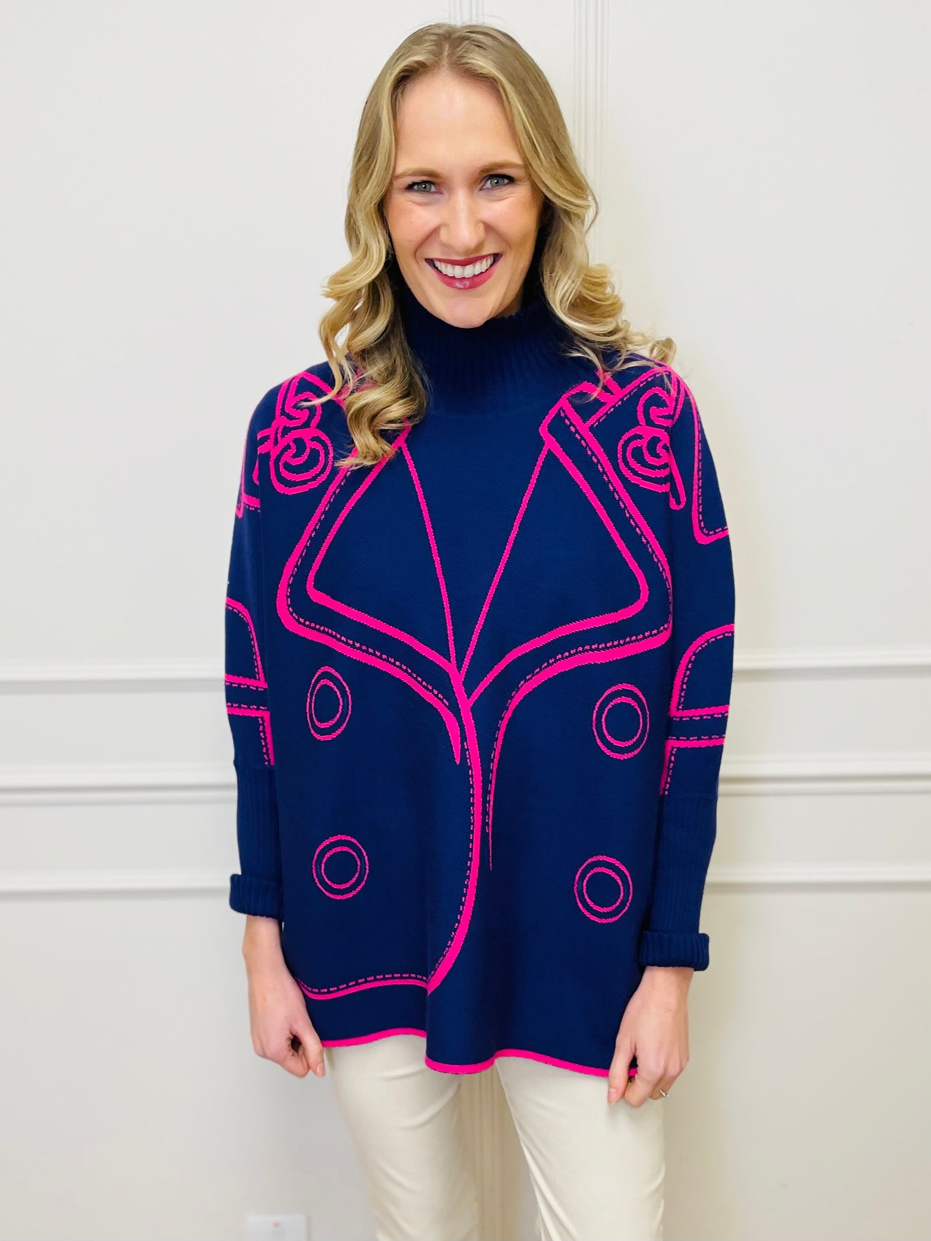 Meet Joy, the jumper that gives you two stylish looks in one. This reversible knit features a bold illustrated coat-style design on one side and a clean, classic finish on the reverse. With a soft roll neck, relaxed fit, and beautifully ribbed sleeves, Joy is the perfect blend of comfort, personality, and effortless style.