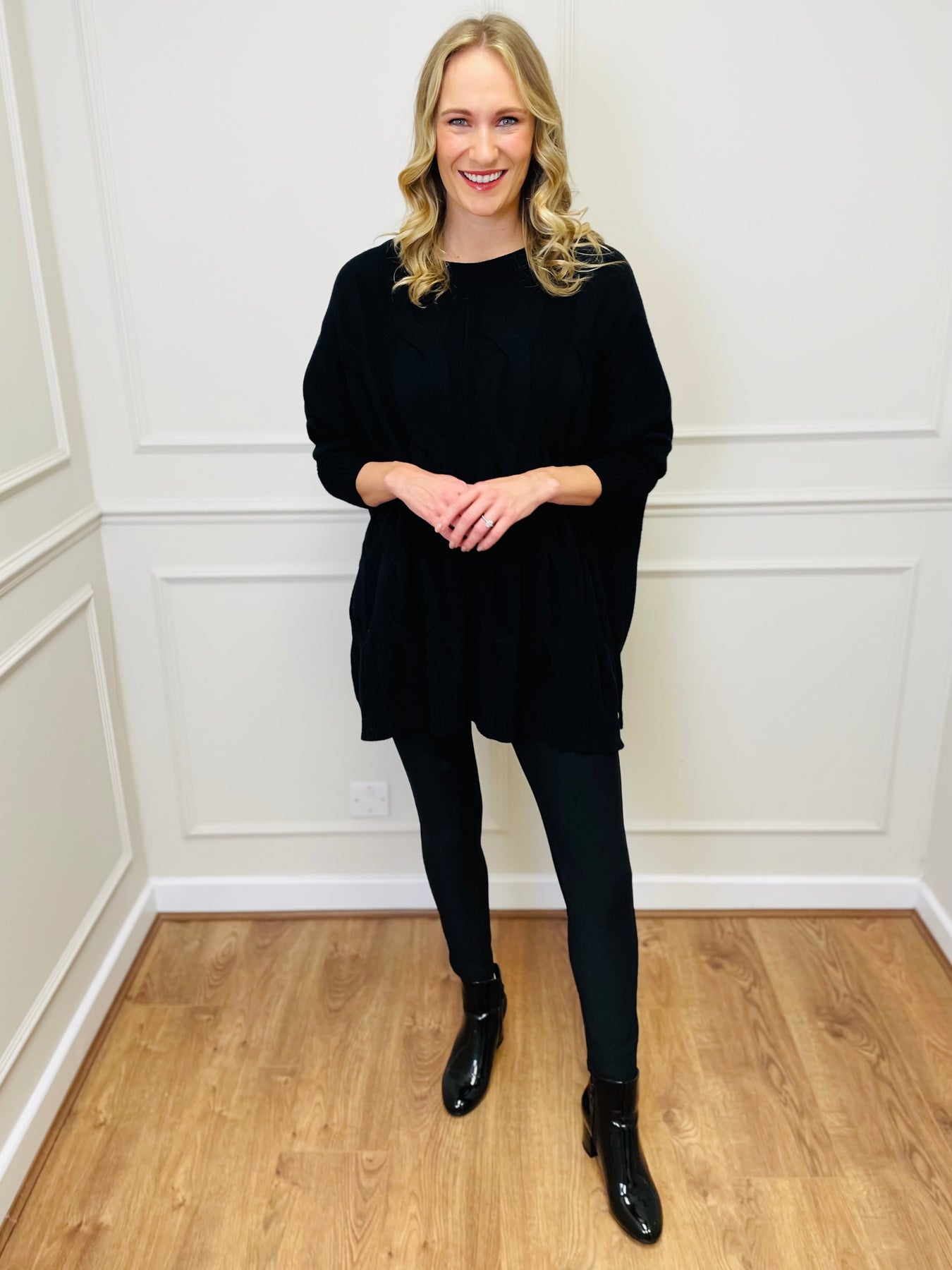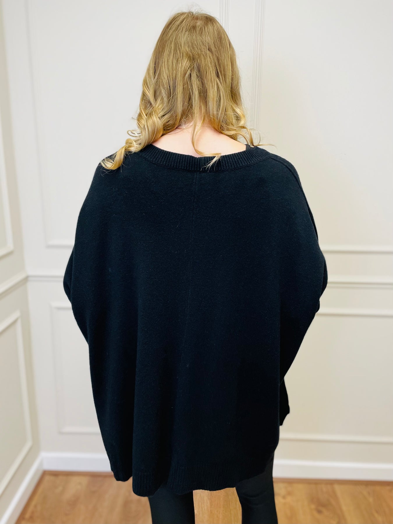 Lydia drapes beautifully over leggings, jeans, or faux leather trousers. The wide sleeves and ribbed cuffs give it a contemporary edge while keeping it timeless and wearable.