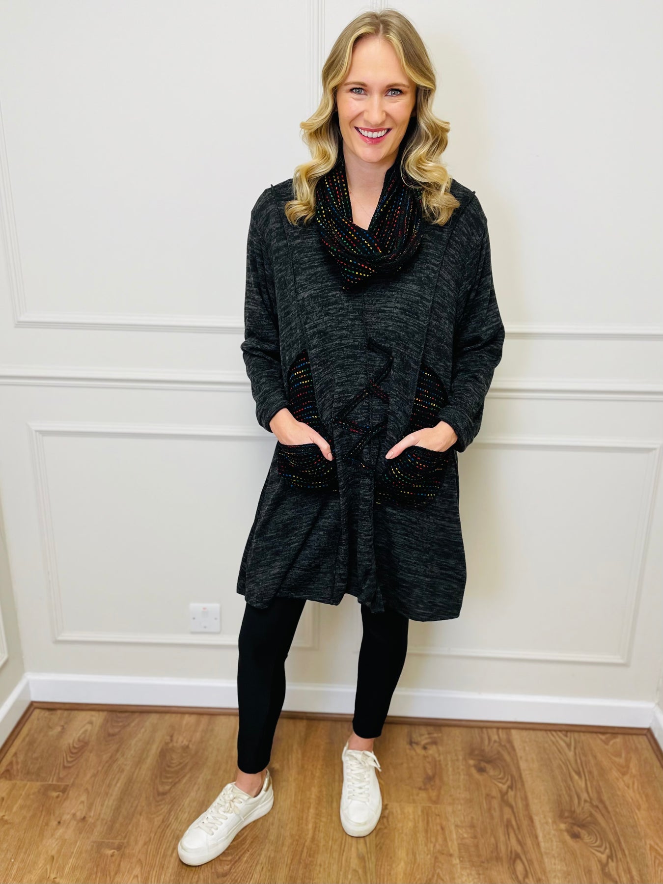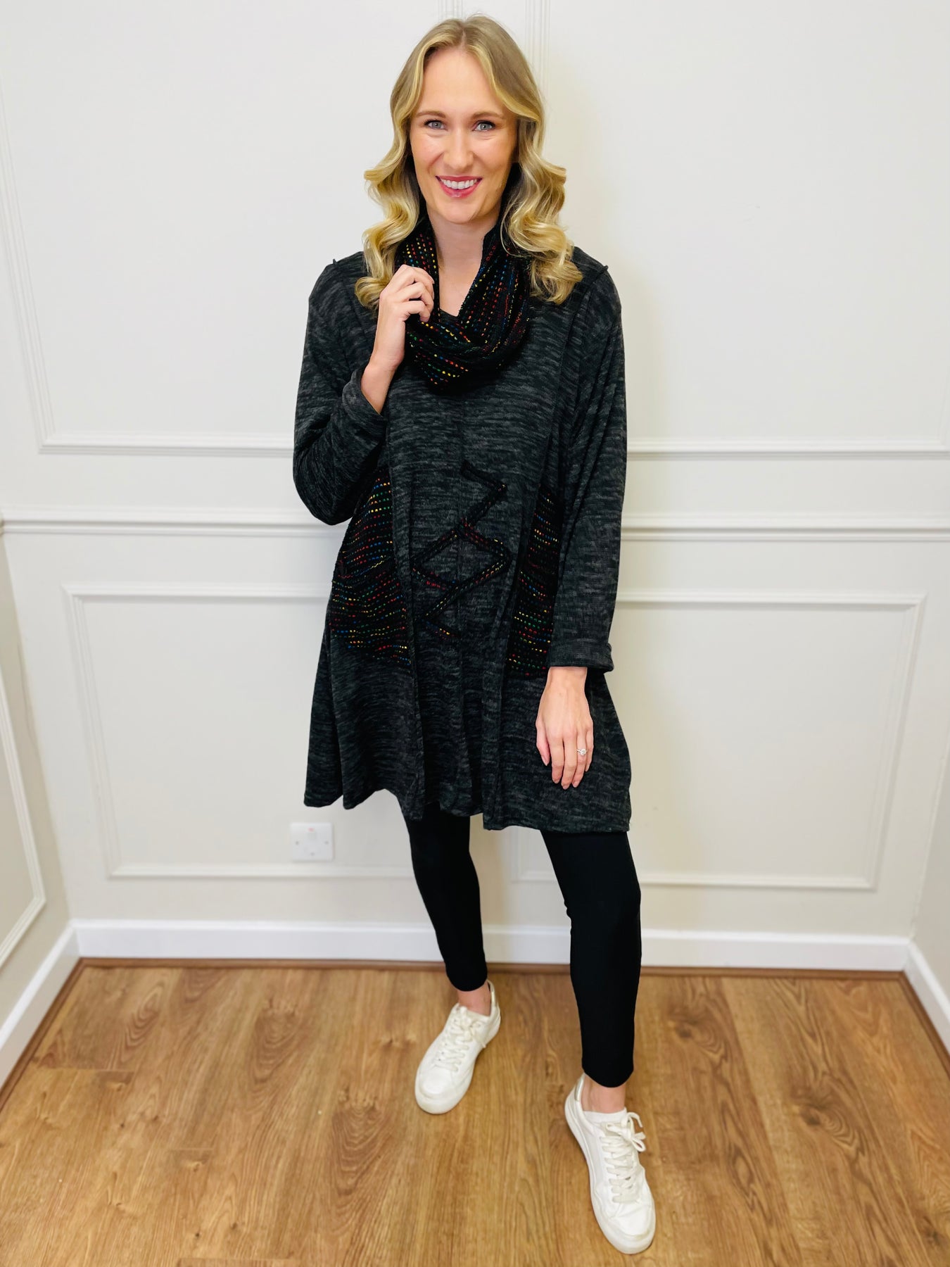 Beautifully soft with a flattering swing shape, this tunic drapes perfectly on all body shapes from size 12 through 22. The detachable matching scarf adds that extra touch of versatility — wear it together for a layered, cozy look or remove it for a sleek, simple style.