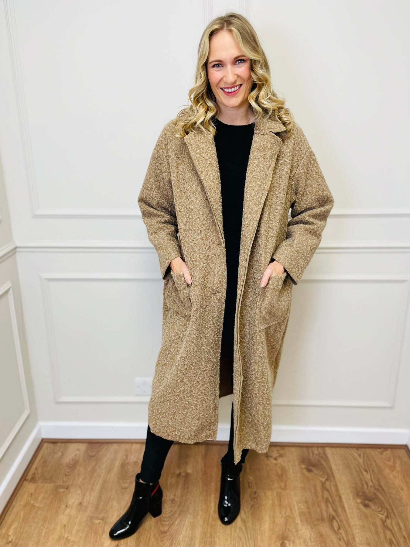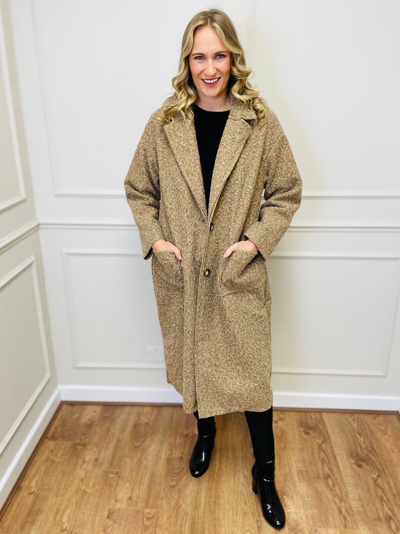 Crafted from a soft, cozy boucle-style fabric, it offers warmth without bulk — the perfect piece for those chic, on-the-go days. With its notched lapel collar, deep front pockets, and button fastening, Alana brings sophistication and ease in equal measure.