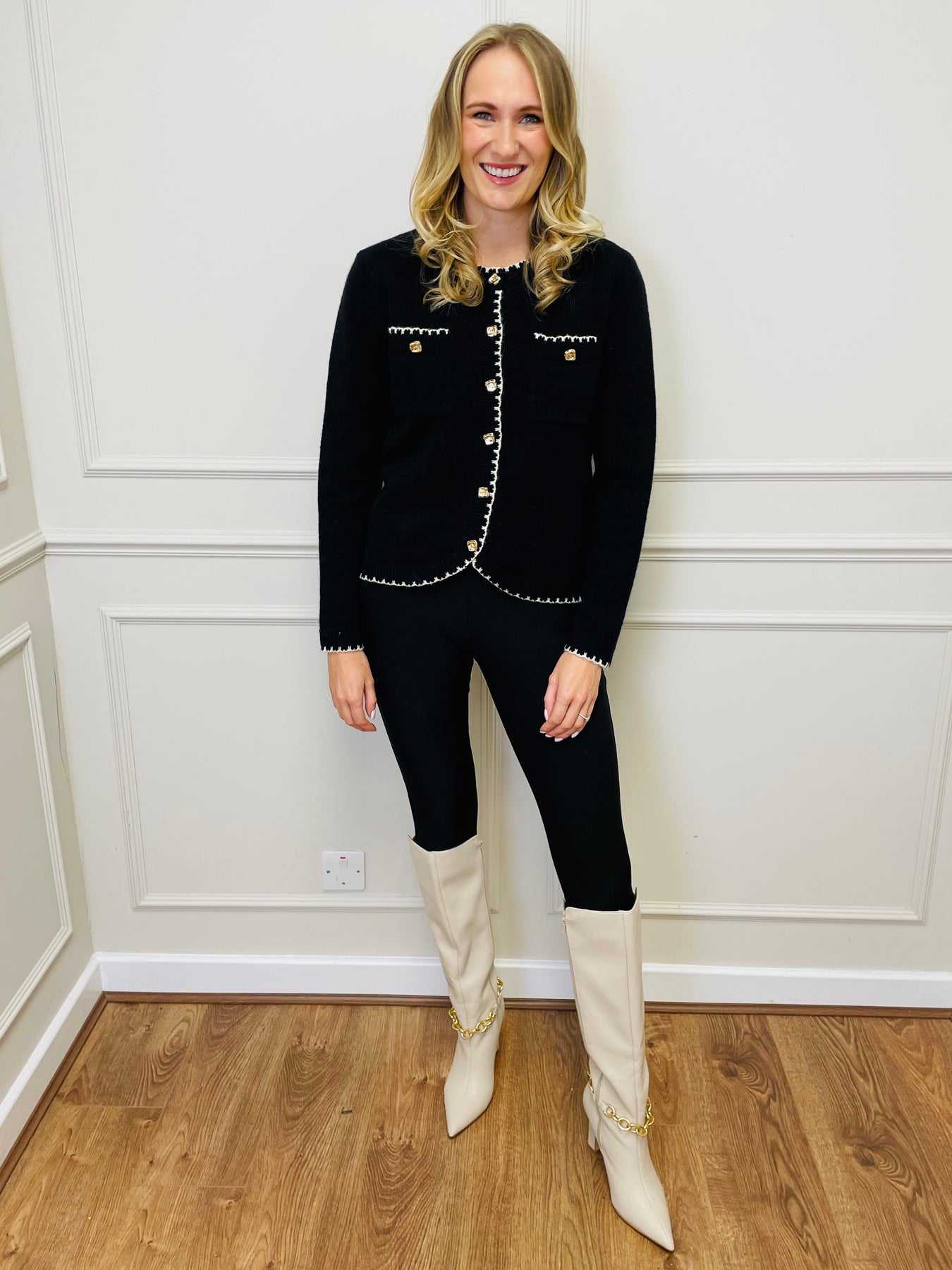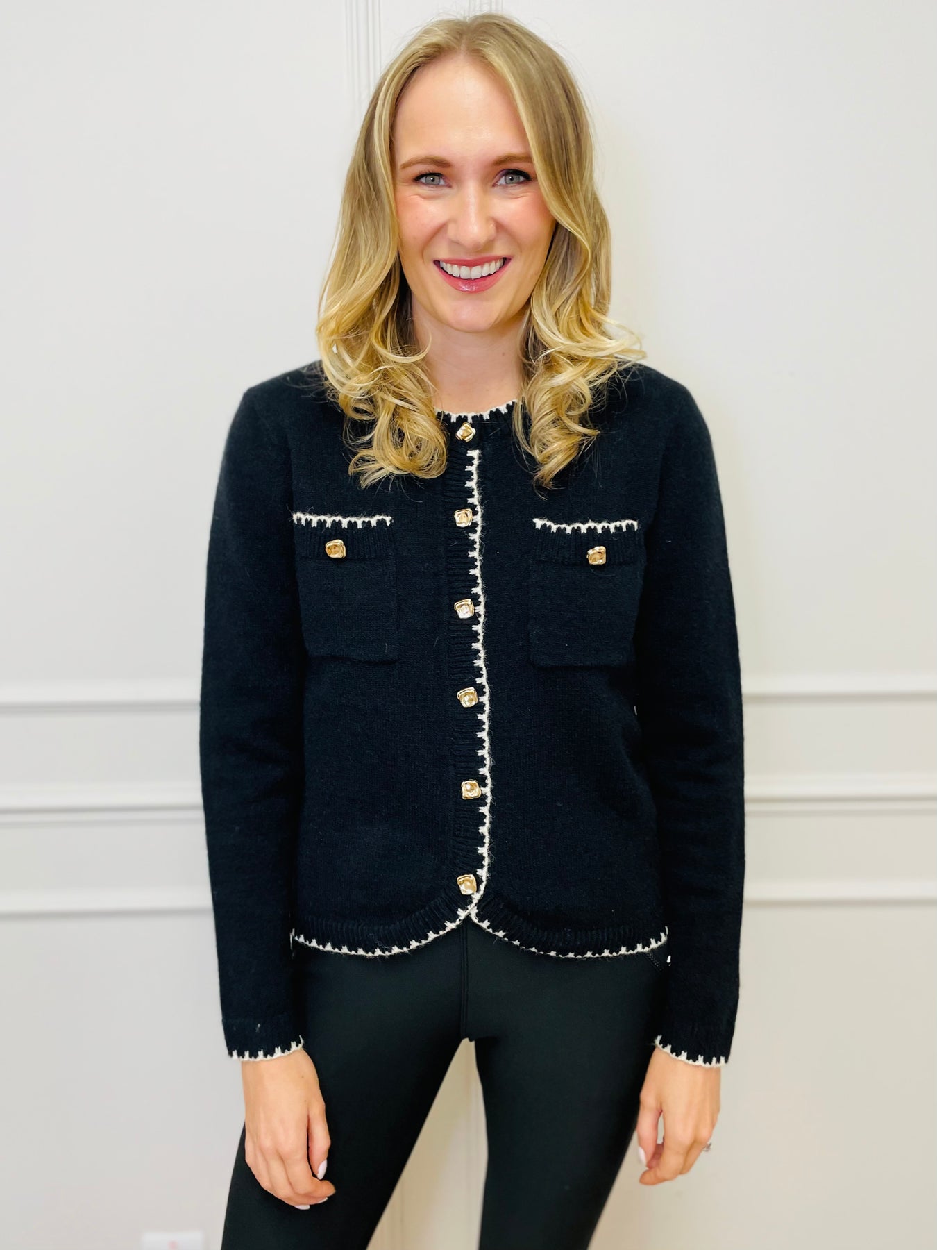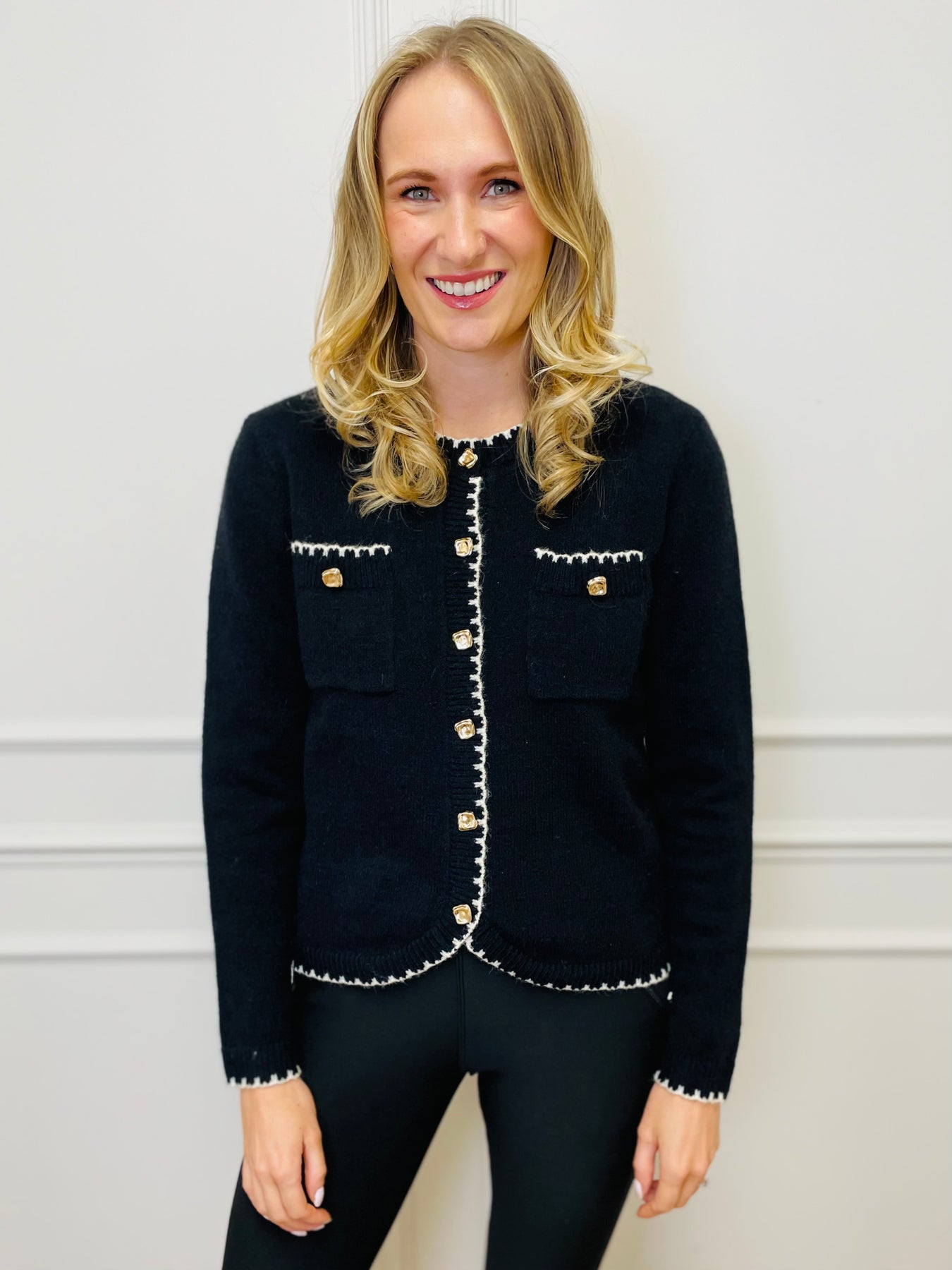 Chic, classic, and beautifully detailed — the Helena Cardigan is your new elevated wardrobe staple. Inspired by timeless Parisian styling, this knit jacket features gold statement buttons, contrast whipstitch edging, and a softly structured silhouette that instantly adds polish to any outfit.