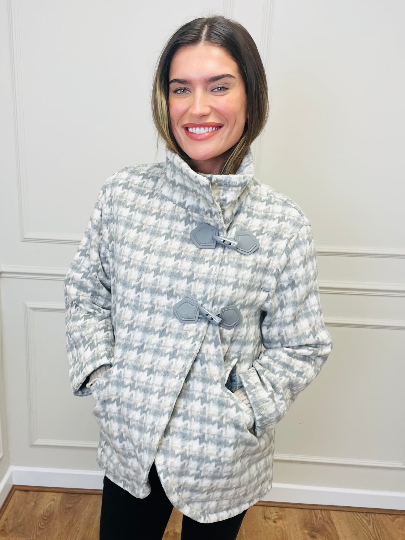 The Samira Coat in Grey Houndstooth is a beautifully structured outerwear piece designed to blend timeless tailoring with everyday comfort. The coat features a soft-touch woven fabric with a muted grey-and-ivory houndstooth pattern — elegant, subtle, and perfect for autumn/winter layering.