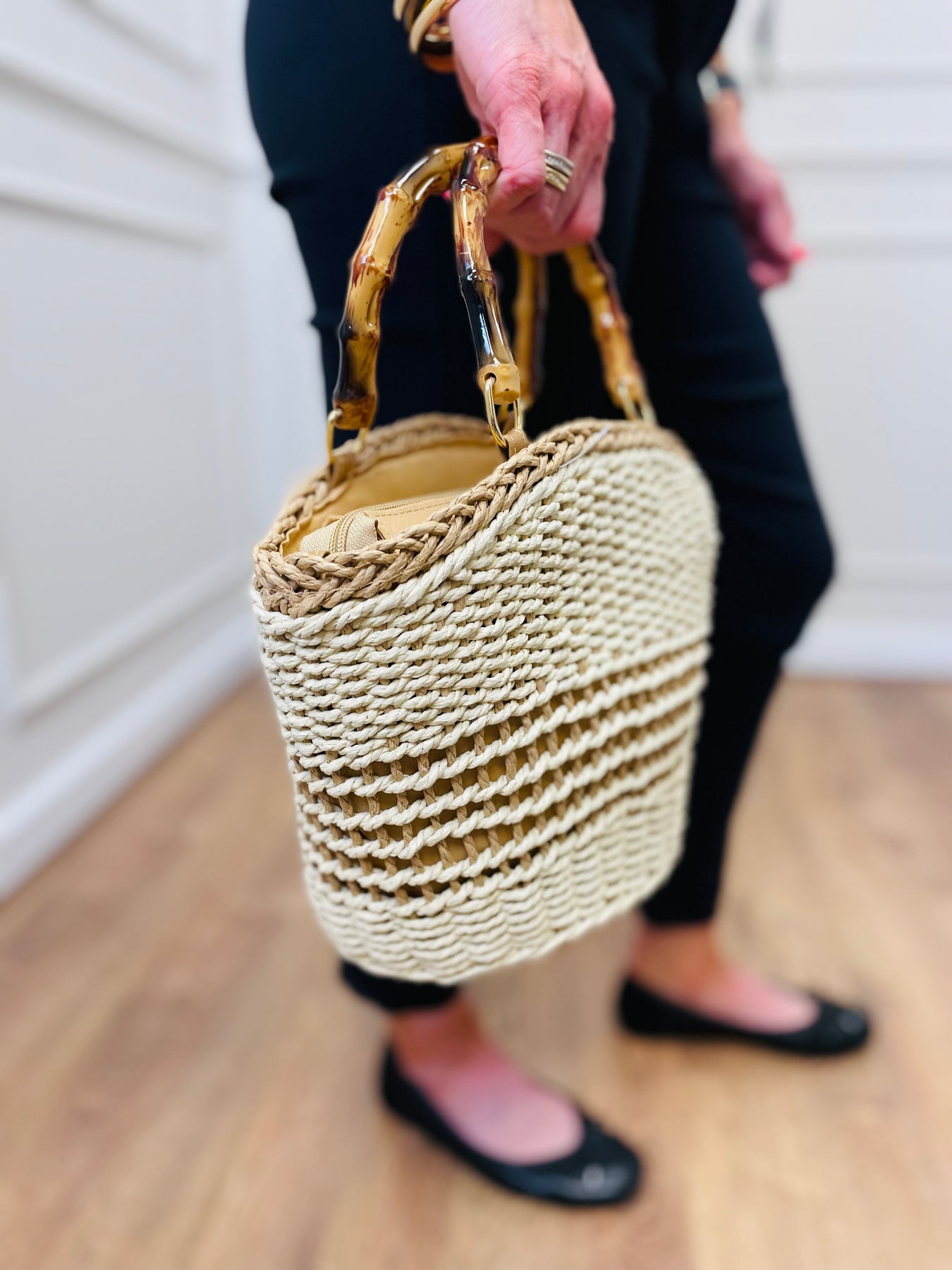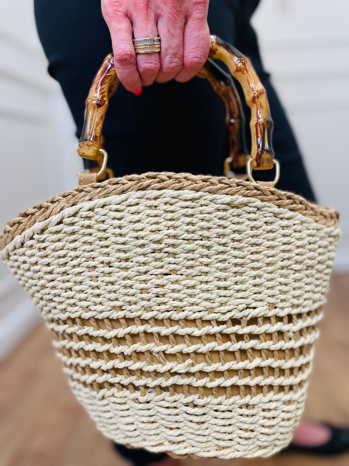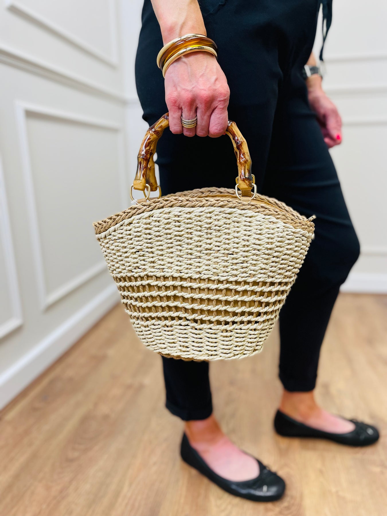 Channel coastal charm with this Straw Basket Bag, your must-have accessory for summer strolls, beach markets, or weekend brunch. Handwoven with natural straw and accented by glossy bamboo-style handles, this bag blends rustic texture with sophisticated details.